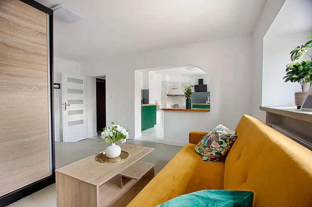 Oferta idealna dla jednej bądź dwóch osób poszukujących kawalerki w spokojnym sąsiedztwie, blisko terenów zielonych.