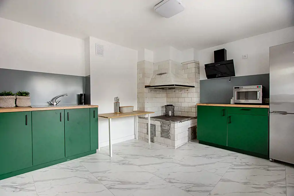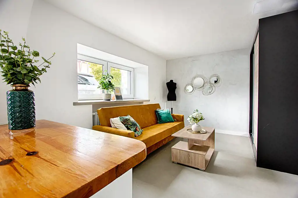 Mieszkanie zostało zaaranżowane w podpiwniczeniu w 2.piętrowym budynku mieszkalnym. Posiada otwarty i przestrzenny rozkład i jest jednostronne. W kawalerce pozostawiono piec kaflowy, który dodaje wnętrzu charakteru. Na powierzchnię ponad 33m2 składa się pokój połączony z aneksem kuchennym oraz łazienka z WC.