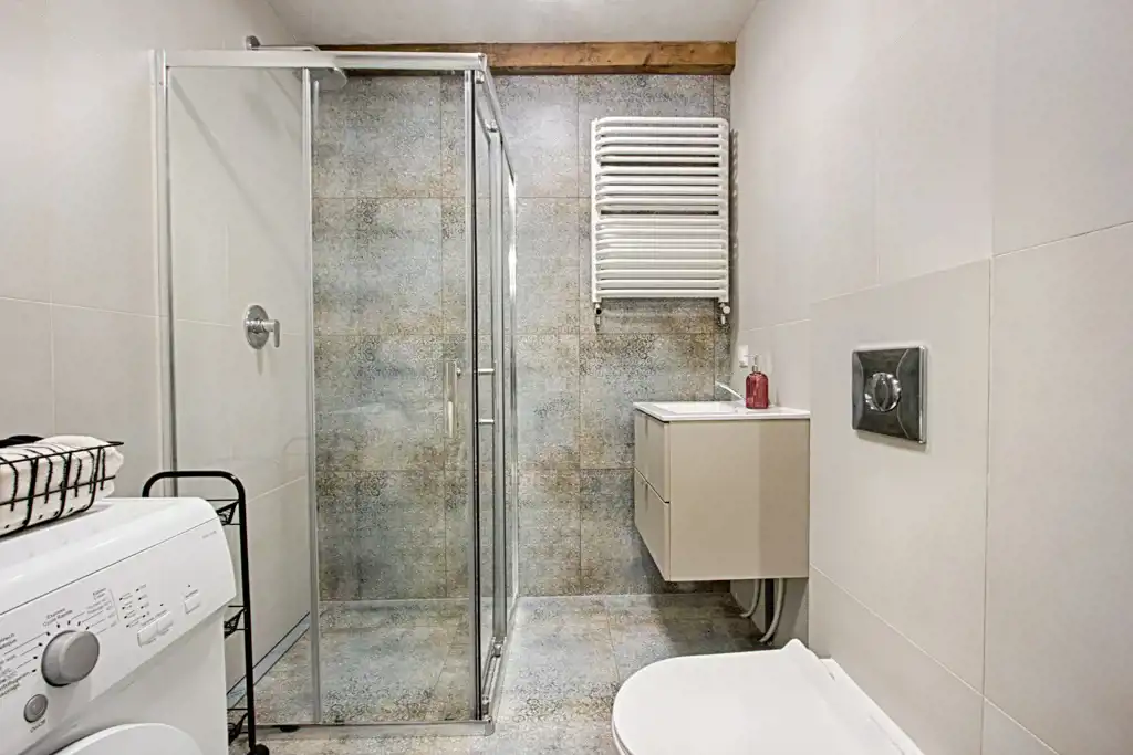 - łazienka (pralka, kabina prysznicowa, w-c, umywalka z szafką)
