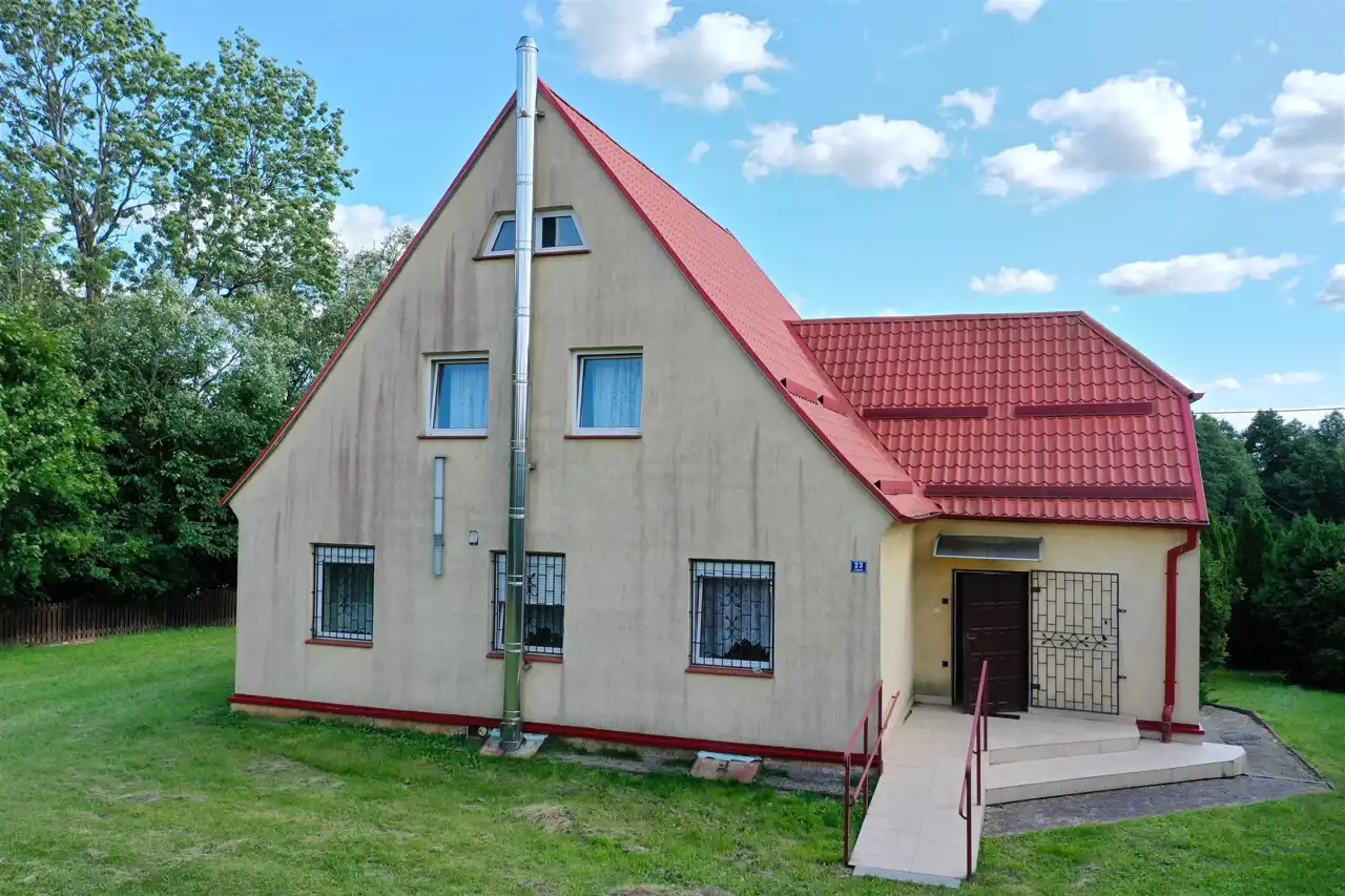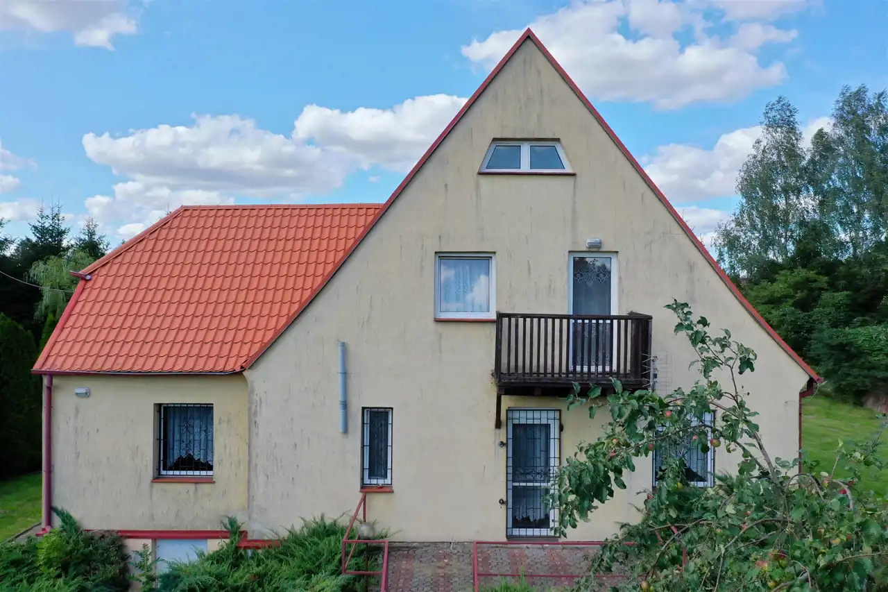 Budynek mieszkalny o powierzchni użytkowej 97.06 m2, został wybudowany w technologii tradycyjnej z cegły ceramicznej. Dom jednobryłowy w kształcie prostokąta, dach dwuspadowy, pokryty dachówką ceramiczną. Wszystkie okna plastikowe, stolarka drzwiowa drewniana. Podłogi wyłożone panelami, łazienki wykończone glazurą i terakotą. Do domu przylega część gospodarcza, spełniająca rolę hangaru. Dom składa się z parteru i poddasza. Na parterze znajdują się salon z aneksem kuchennym (17.80 m2), pokój (14.11 m2), łazienka (3.97 m2), część gospodarcza (44.20 m2). Na poddaszu mieszczą się: pokój (10.20 m2), łazienka (4.35 m2), przedpokój (2.43 m2).
