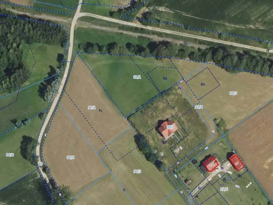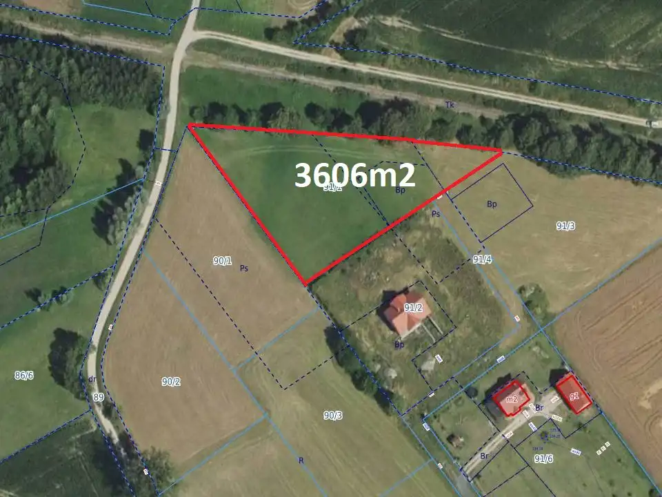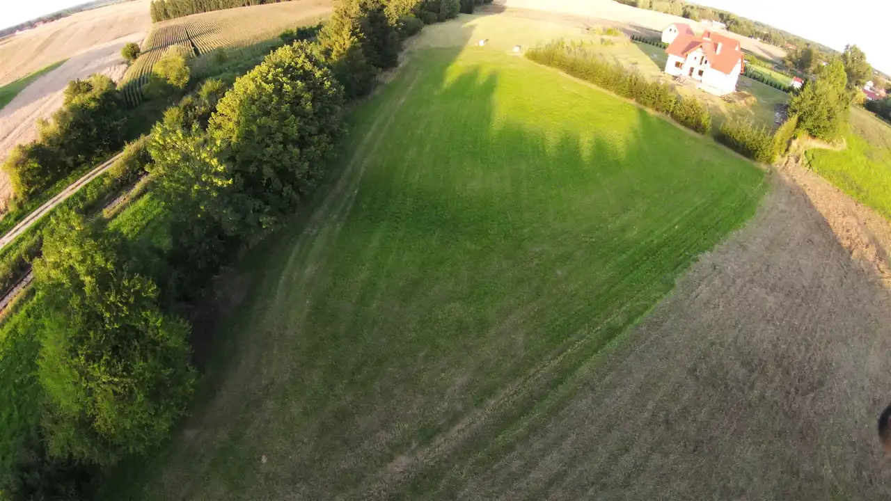 Działka jest płaska w kształcie trójkąta, niezagospodarowana.