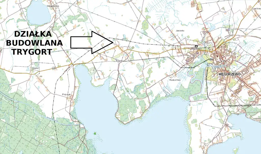 Działka zlokalizowana jest w miejscowości Trygort koło Węgorzewa (ok.5km). Działka oddalona jest zaledwie 1,5km (w linii prostej) od północnej części jeziora Mamry (Szlak WJM) zwanej jeziorem „Przystań”.