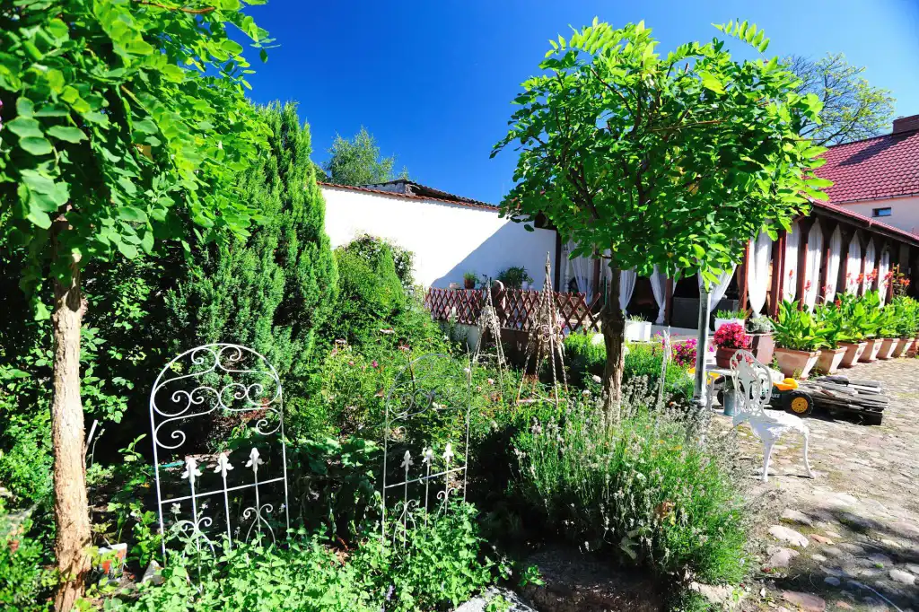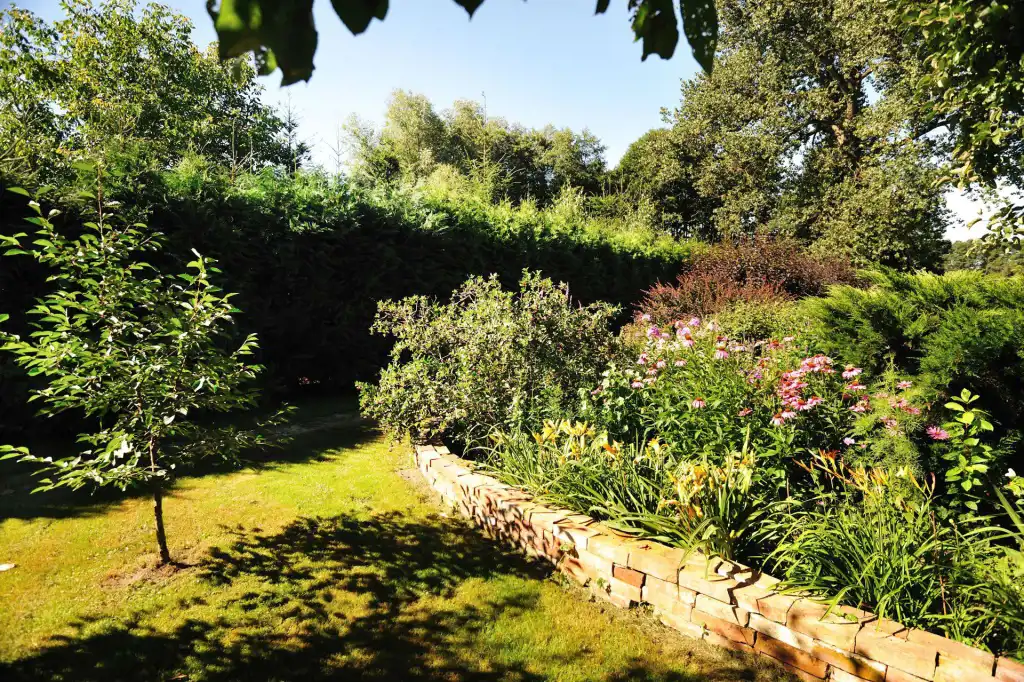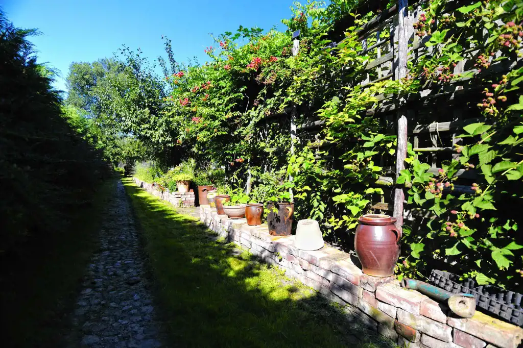 Część ogrodu zajmują: sad, maliniak, mała plantacja borówek amerykańskich i kamczackich oraz warzywnik z grządkami wyniesionymi (w stylu angielskim).