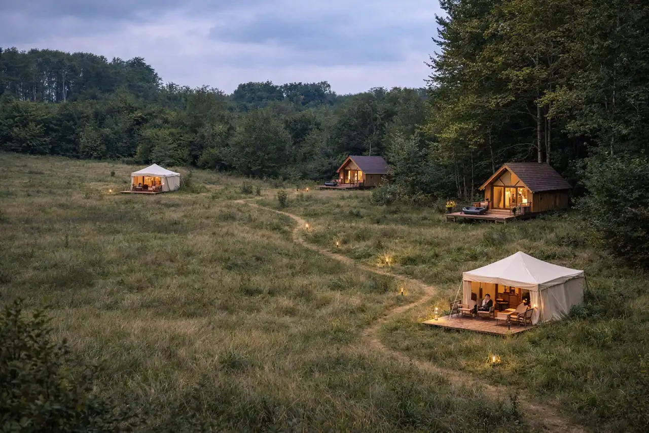 namioty glampingowe typu safari -rozmieszczone w większej odległości od siebie, zapewniające prywatność i kontakt z naturą