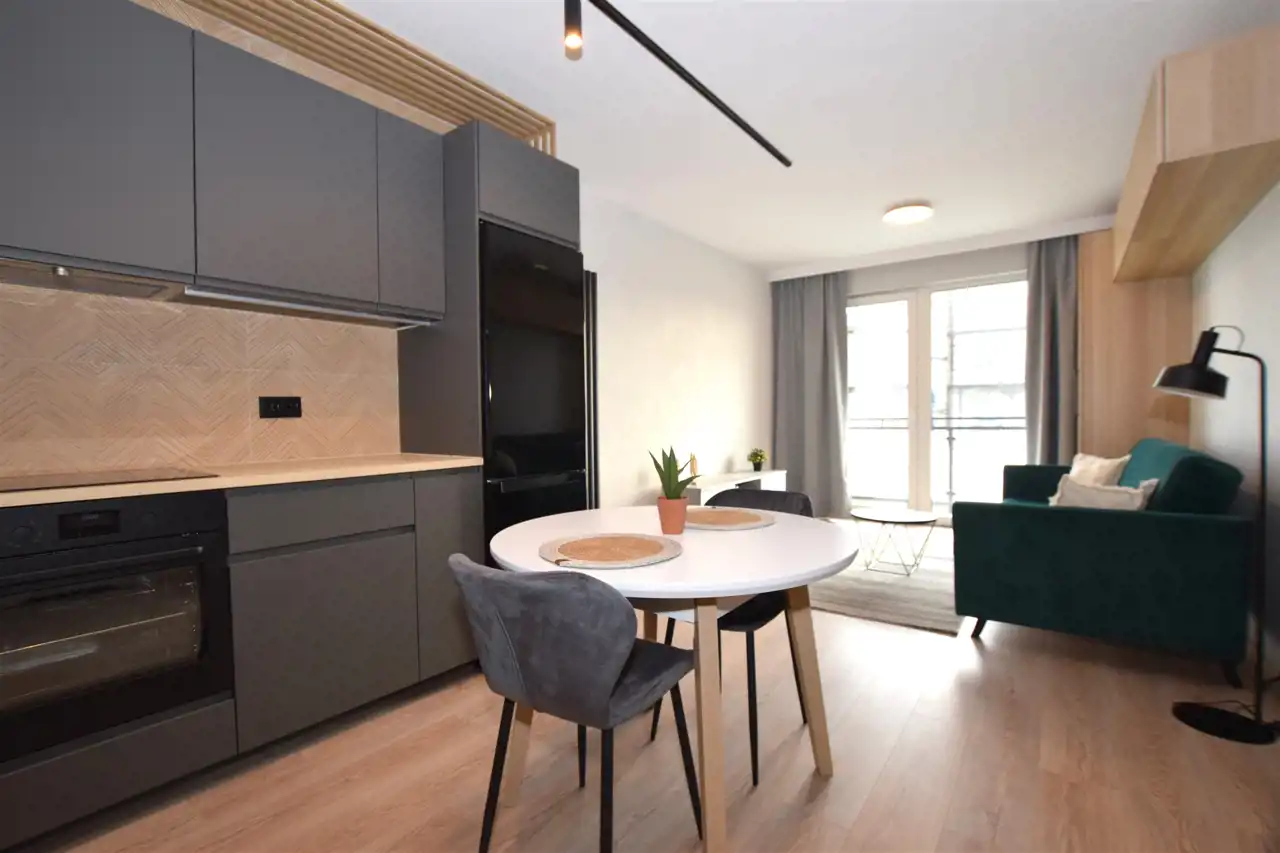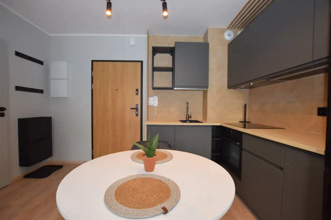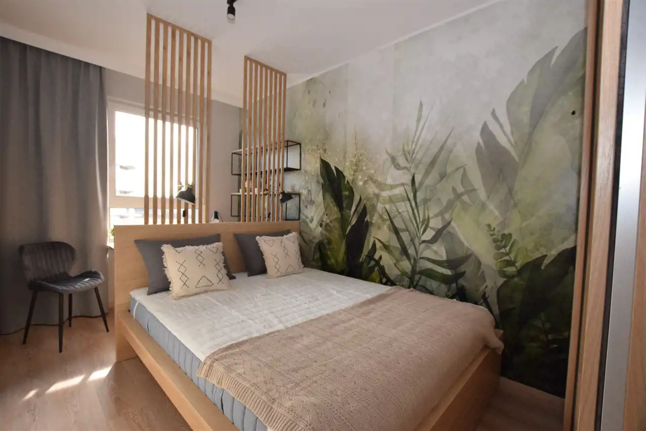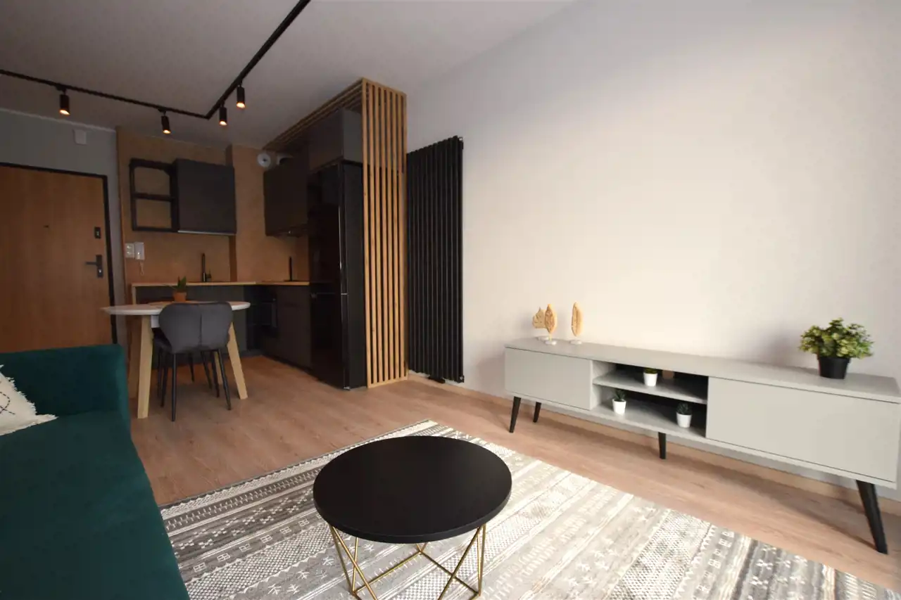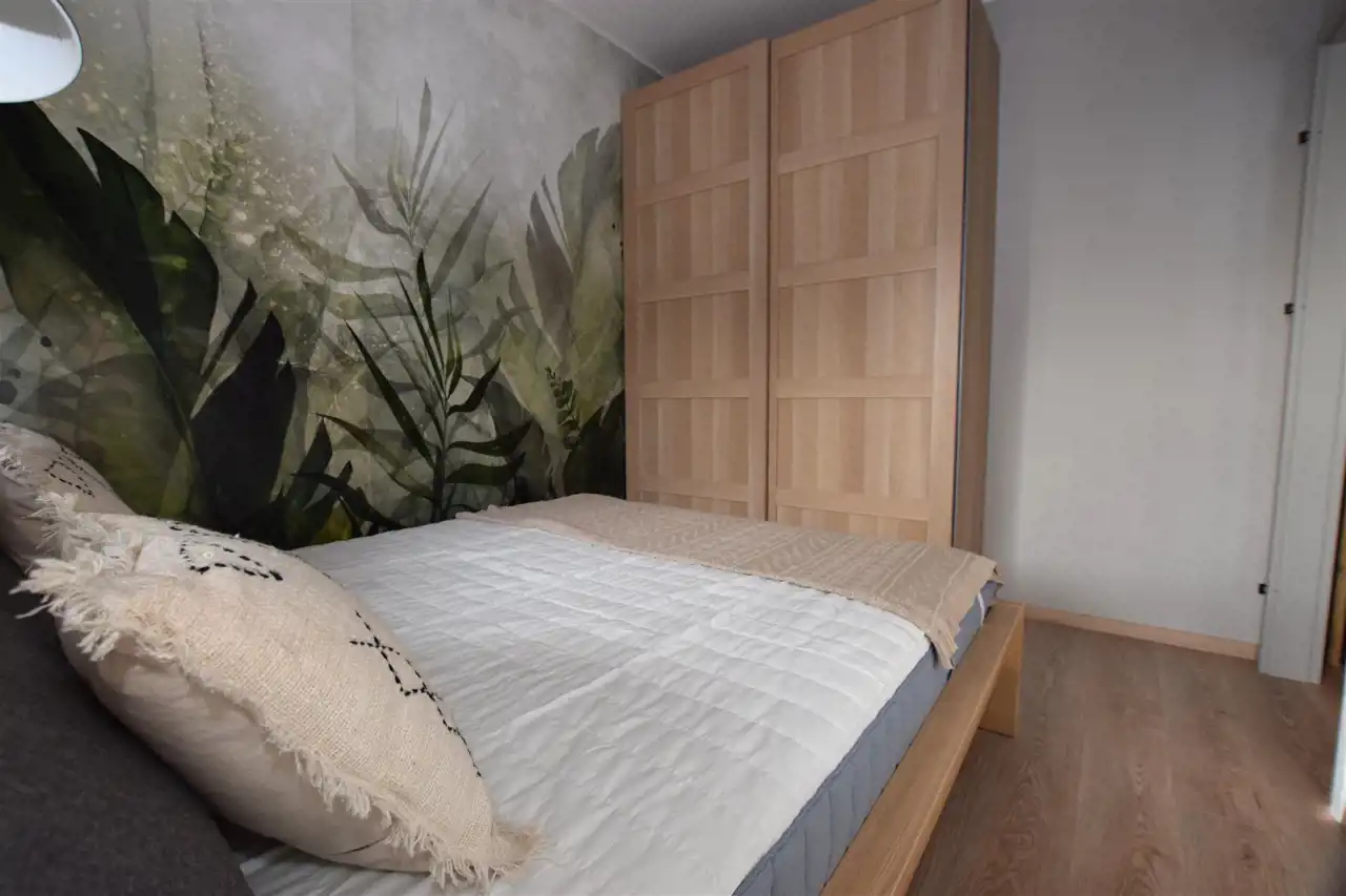 Do mieszkania dostaniemy się drzwiami antywłamaniowymi do przedpokoju, gdzie wygospodarowano miejsce na szafkę na buty, lustro i wieszaki. Z przedpokoju płynnie przechodzimy do słonecznego salonu z aneksem kuchennym, w którym znajduje się m.in. rozkładany stół z krzesłami oraz wygodna sofa, stolik oraz TV oraz szafa i szafki do przechowywania. Kuchnia wyposażona w sprzęt AGD – płyta, piekarnik, okap, lodówka, zmywarka. Z tego pokoju dostaniemy się również na słoneczny balkon. Do dyspozycji dodatkowy, ustawny pokój, pełniący funkcję sypialni ze zmyślnie wydzieloną przestrzenią do pracy (pełnowymiarowe biurko z krzesłem), wyposażony w duże łóżko, funkcjonalną szafę z wieszakami, półkami i koszami. Przestronna łazienka wyposażona została w kabinę prysznicową z odpływem liniowym, podwieszaną toaletę, umywalkę, funkcjonalne meble łazienkowe oraz pralkę. Podłogi w całym mieszkaniu poza łazienką wyłożono panelami.