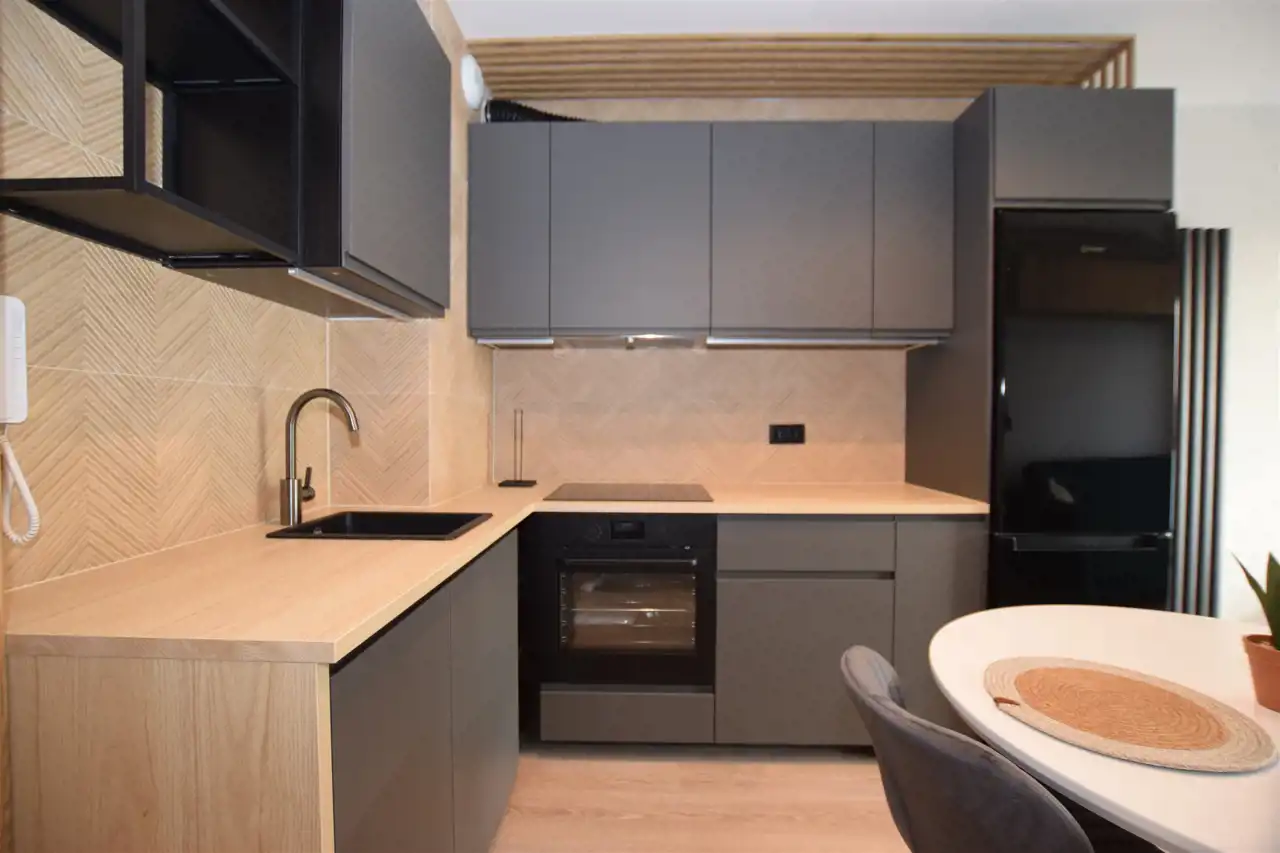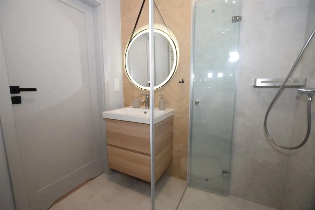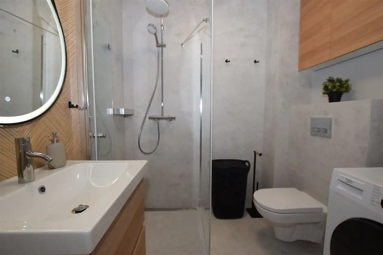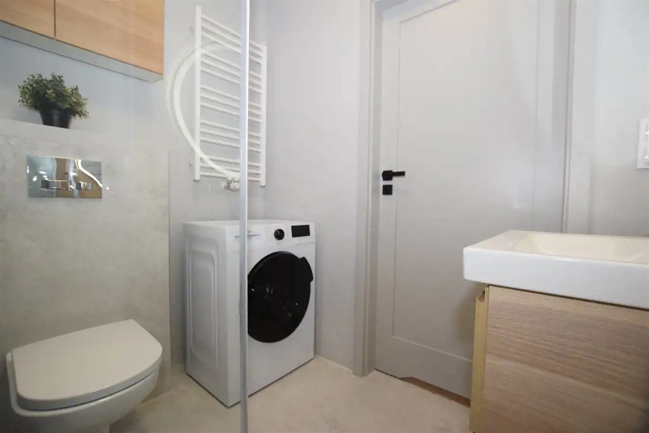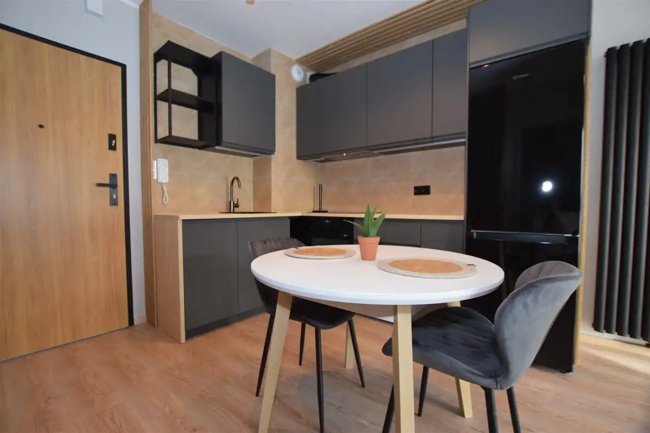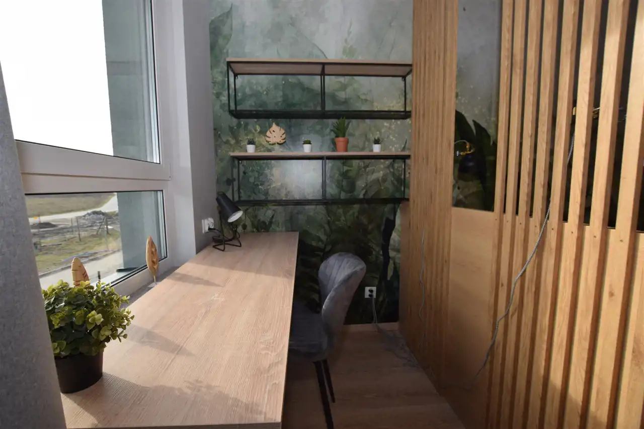 Do mieszkania dostaniemy się drzwiami antywłamaniowymi do przedpokoju, gdzie wygospodarowano miejsce na szafkę na buty, lustro i wieszaki. Z przedpokoju płynnie przechodzimy do słonecznego salonu z aneksem kuchennym, w którym znajduje się m.in. rozkładany stół z krzesłami oraz wygodna sofa, stolik oraz TV oraz szafa i szafki do przechowywania. Kuchnia wyposażona w sprzęt AGD – płyta, piekarnik, okap, lodówka, zmywarka. Z tego pokoju dostaniemy się również na słoneczny balkon. Do dyspozycji dodatkowy, ustawny pokój, pełniący funkcję sypialni ze zmyślnie wydzieloną przestrzenią do pracy (pełnowymiarowe biurko z krzesłem), wyposażony w duże łóżko, funkcjonalną szafę z wieszakami, półkami i koszami. Przestronna łazienka wyposażona została w kabinę prysznicową z odpływem liniowym, podwieszaną toaletę, umywalkę, funkcjonalne meble łazienkowe oraz pralkę. Podłogi w całym mieszkaniu poza łazienką wyłożono panelami.