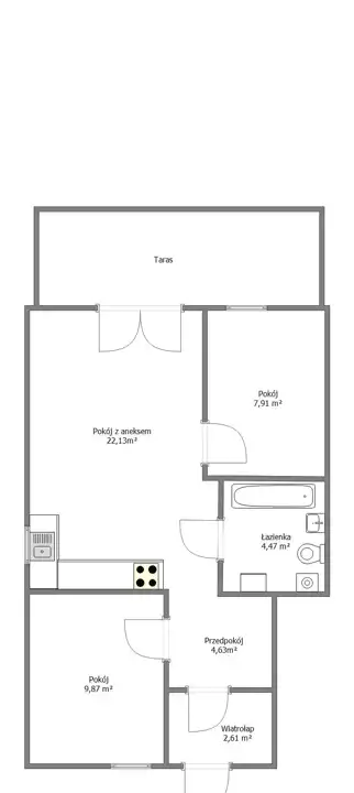 Prezentowane mieszkanie składa się z ładnie doświetlonego, sporego pokoju dziennego z aneksem kuchennym (22,13m2), 2 pokoi (9,87;7,91m2), wiatrołapu i korytarza z miejscami na szafy w zabudowie oraz ustawnej łazienki (4,47m2). Z salonu dostaniemy się na słoneczny taras i do ogrodu. Duże okno balkonowe z pewnością stanowi fantastyczne rozwiązanie w upalne dni, kiedy z radością większą część czasu będziemy spędzać w ogrodzie.