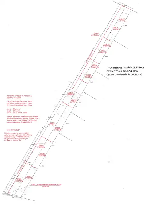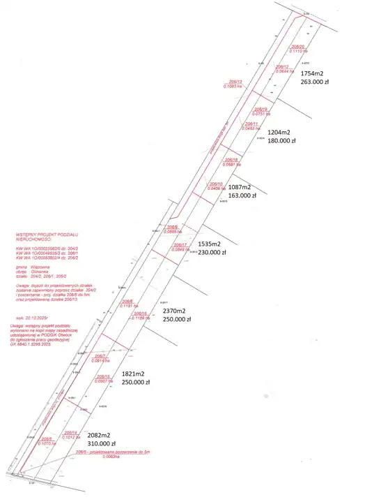 Dla działek 206/1, 206/2, 204/2 zostały wydane warunki zabudowy na budowę 7 domów jednorodzinnych na podstawie których aktualnie geodeta dzieli działkę na 7 działek - każda pod budowę jednego domu jednorodzinnego. Szczegóły powierzchni są ujawnione na projekcie podziału, który jest załączony do tego ogłoszenia.