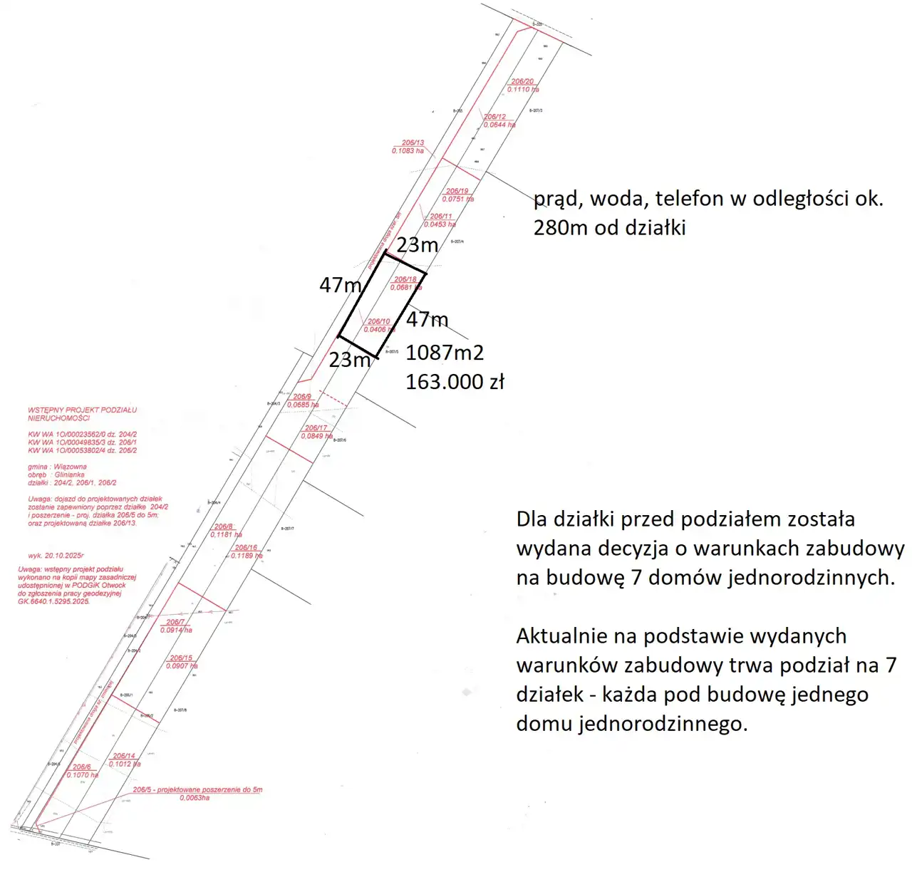 Dla działek 206/1, 206/2, 204/2 zostały wydane warunki zabudowy na budowę 7 domów jednorodzinnych na podstawie których aktualnie geodeta dzieli działkę na 7 działek - każda pod budowę jednego domu jednorodzinnego. Szczegóły powierzchni są ujawnione na projekcie podziału, który jest załączony do tego ogłoszenia.