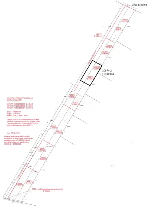 Numery ewidencyjny 206/1, 206/2, 204/2 ( w trakcie podziału zgodnie z mapą załączoną do ogłoszenia) - PIĄTA linia zabudowy od ul. Szkolnej lub trzecia linia zabudowy od drugiej strony też ul. Szkolnej.