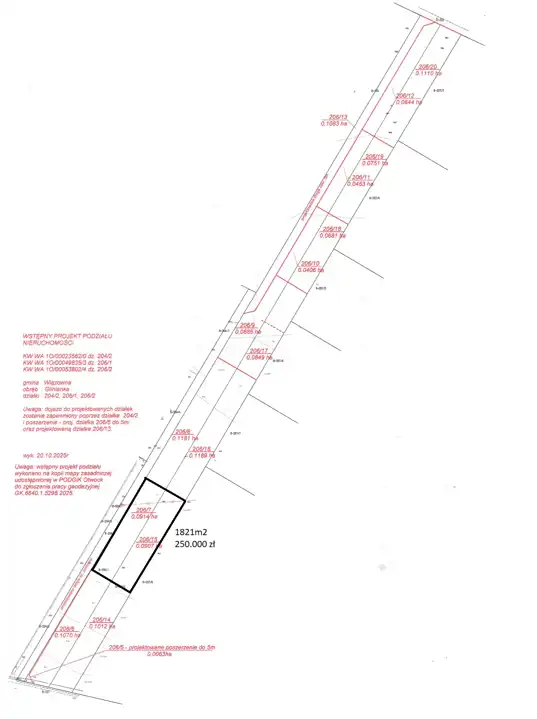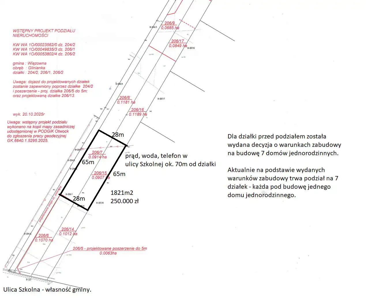 Dla działek 206/1, 206/2, 204/2 zostały wydane warunki zabudowy na budowę 7 domów jednorodzinnych na podstawie których aktualnie geodeta dzieli działkę na 7 działek - każda pod budowę jednego domu jednorodzinnego. Szczegóły powierzchni są ujawnione na projekcie podziału, który jest załączony do tego ogłoszenia.