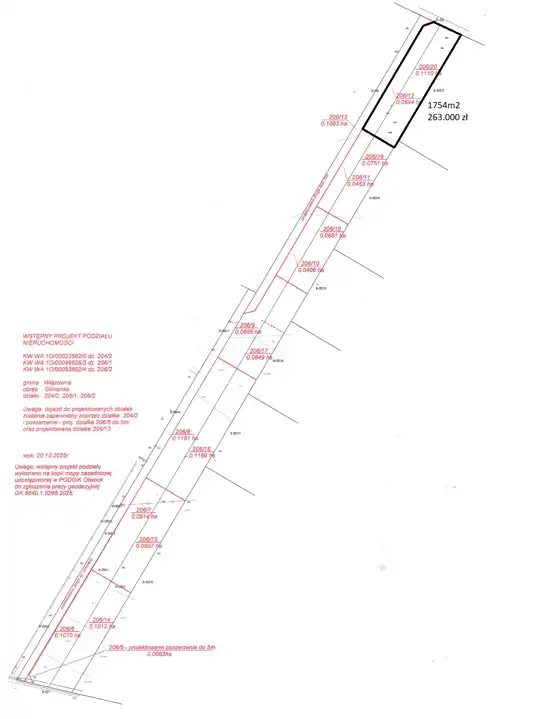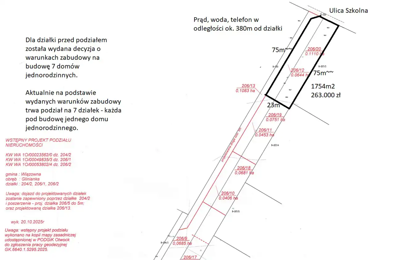 Dla działek 206/1, 206/2, 204/2 zostały wydane warunki zabudowy na budowę 7 domów jednorodzinnych na podstawie których aktualnie geodeta dzieli działkę na 7 działek - każda pod budowę jednego domu jednorodzinnego. Szczegóły powierzchni są ujawnione na projekcie podziału, który jest załączony do tego ogłoszenia.