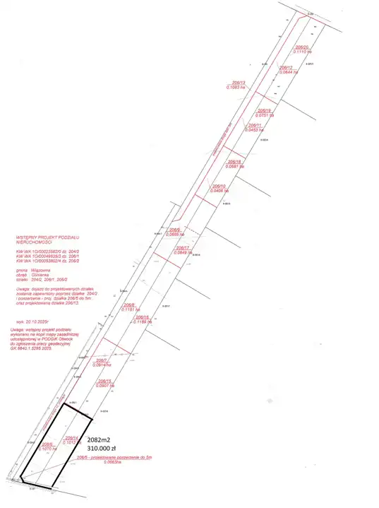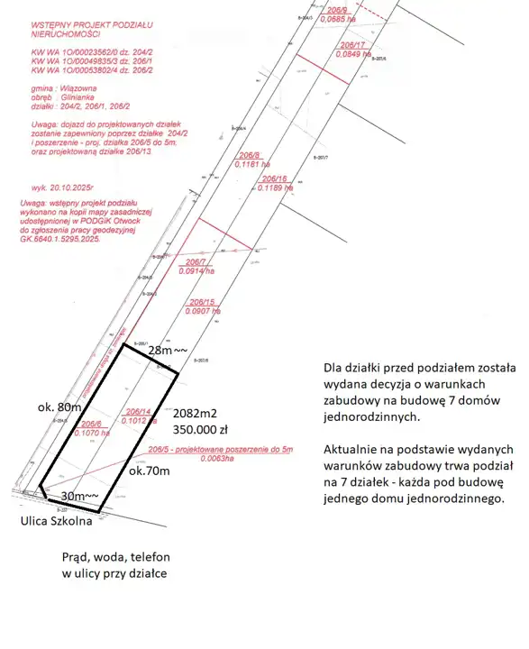 Dla działek 206/1, 206/2, 204/2 zostały wydane warunki zabudowy na budowę 7 domów jednorodzinnych na podstawie których aktualnie geodeta dzieli działkę na 7 działek - każda pod budowę jednego domu jednorodzinnego. Szczegóły powierzchni są ujawnione na projekcie podziału, który jest załączony do tego ogłoszenia.