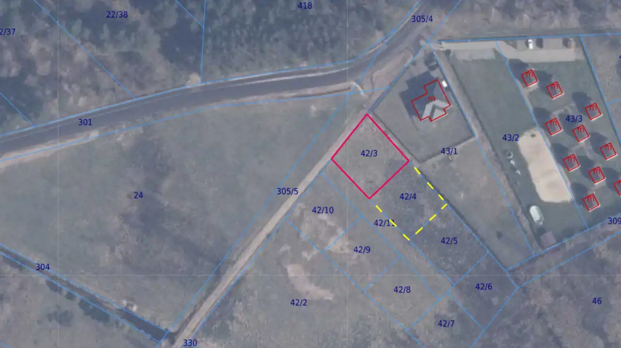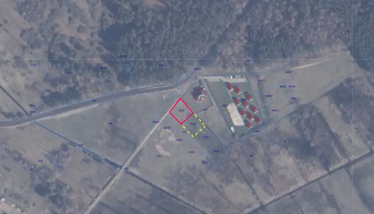 Istnieje możliwość zakupu dodatkowej, przylegającej działki nr 42/4 o powierzchni 675 m², zaznaczonej na rzucie (żółtą linią przerywana). Daje to wyjątkową okazję do stworzenia dużej posiadłości o łącznej powierzchni 1395 m² – idealnej dla osób, które chcą więcej przestrzeni, prywatności albo planują dodatkową infrastrukturę (ogród, garaż, domek rekreacyjny).