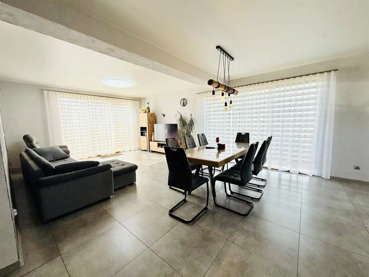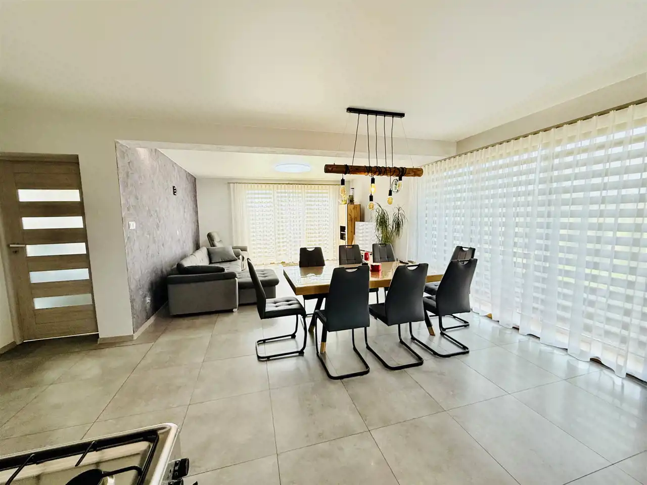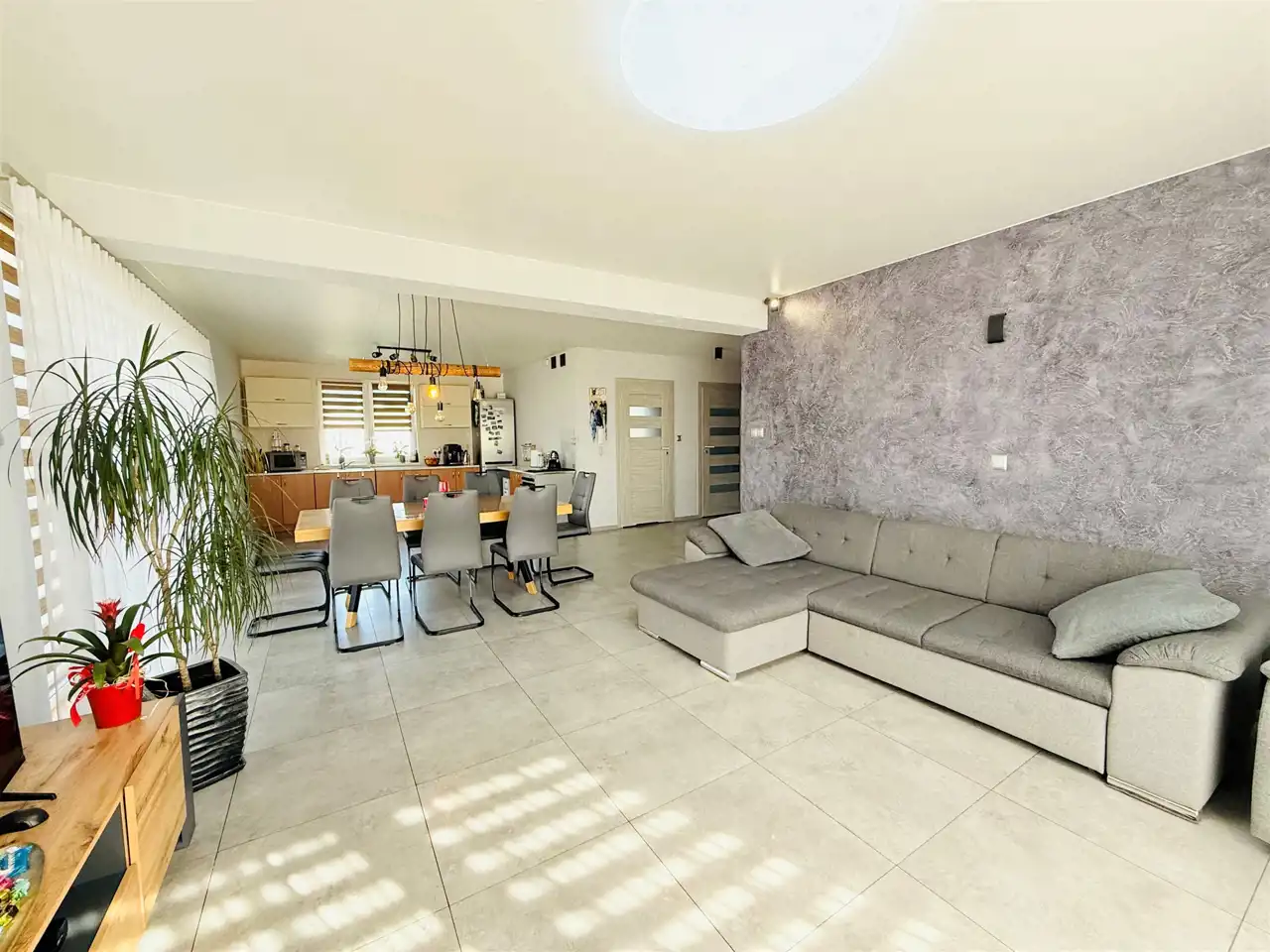przestronny salon połączony z jadalnią i aneksem kuchennym, tworzący otwartą, jasną strefę dzienną,