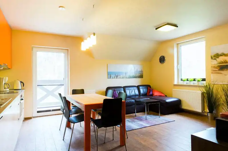 Apartament komfortowo urządzony składa się z salonu z aneksem jadalnym z wyjściem na duży balkon, łazienki z WC oraz na poddaszu dużej sypialni.