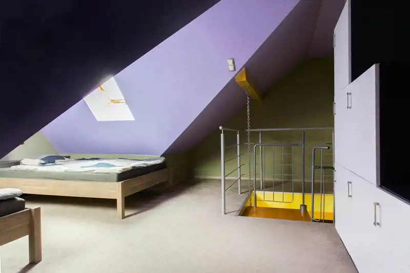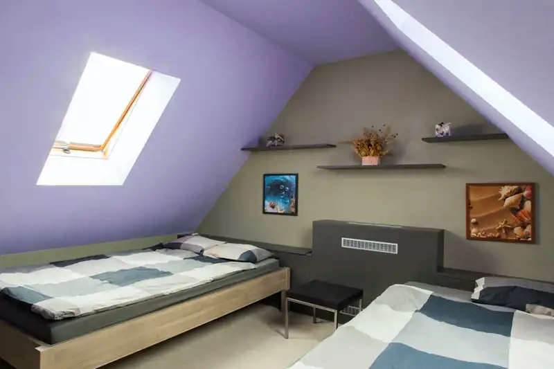 Na poddaszu znajduje się duży pokój z oknami dachowymi doświetlającymi pomieszczenie, dwoma podwójnymi łóżkami, meblami sypialnymi.
