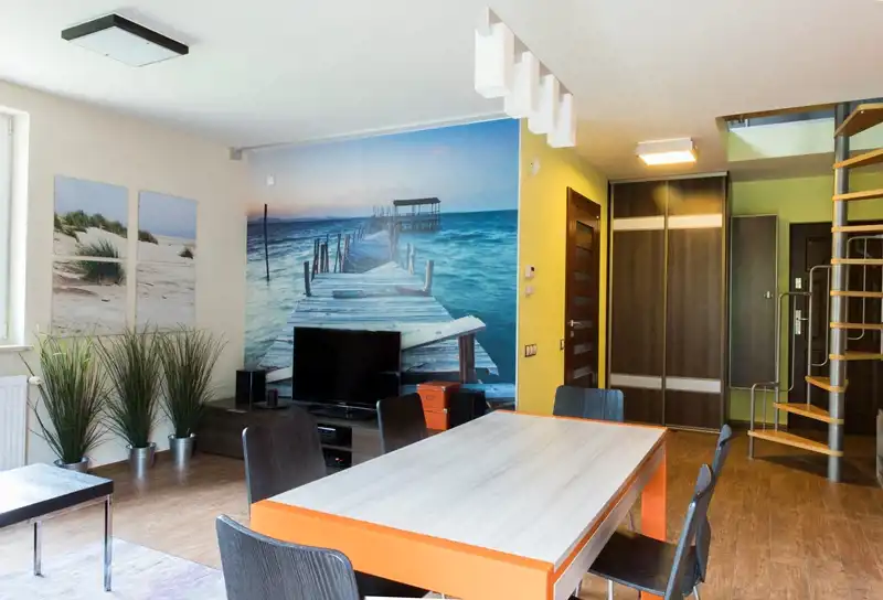 2. Salon z rozkładaną skórzaną kanapą, tv z dostępem do internetu, stół z krzesłami.
