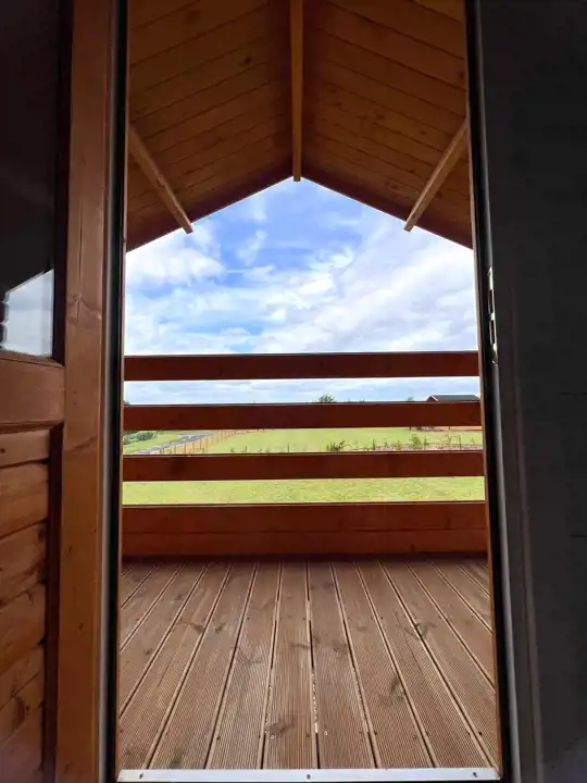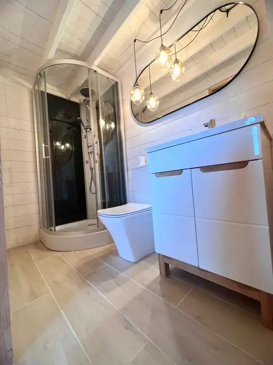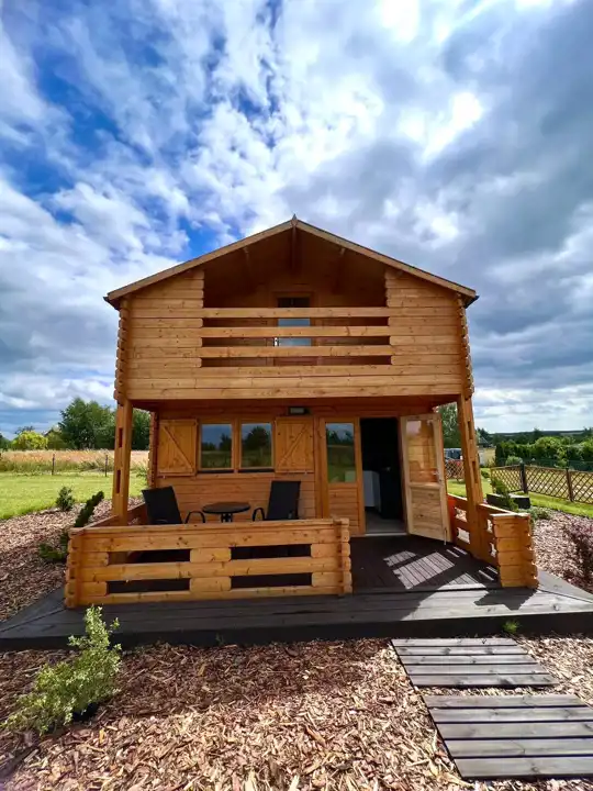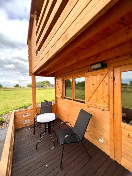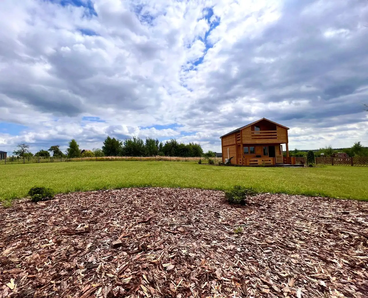 Dom o powierzchni 32m2. Na parterze znajduje się salon wraz z kuchnią i łazienką. Z salonu drewniane schody prowadzą na poddasze, gdzie znajduje się sypialnia wraz z balkonem. Dom wyposażony jest w klimatyzacje z opcją zimową. Na działce znajduje się studnia głębinowa. Domek podłączony jest do zbiornika betonowego bezodpływowego.