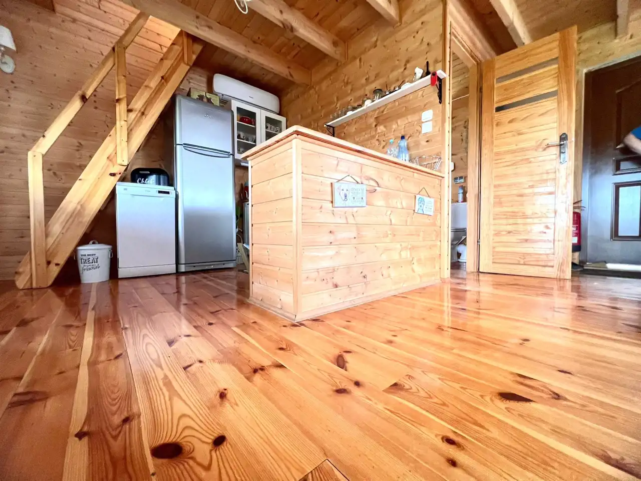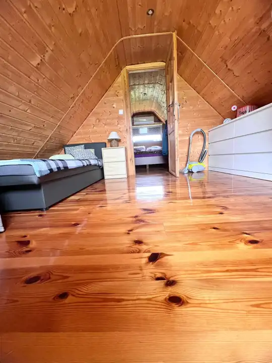 Dom o powierzchni 70m2 wraz z zadaszonym tarasem 21m2. Na parterze znajduje się salon wraz z kuchnią i łazienką. Z salonu drewniane schody prowadzą na poddasze, gdzie znajdziemy dwie sypialnie. Taras wyposażony jest w meble ogrodowe wraz z solidnym grillem gazowym. Rolety zewnętrzne zamontowane są na wszystkich oknach wraz z tarasem, co umożliwia jego całkowite zamknięcie.