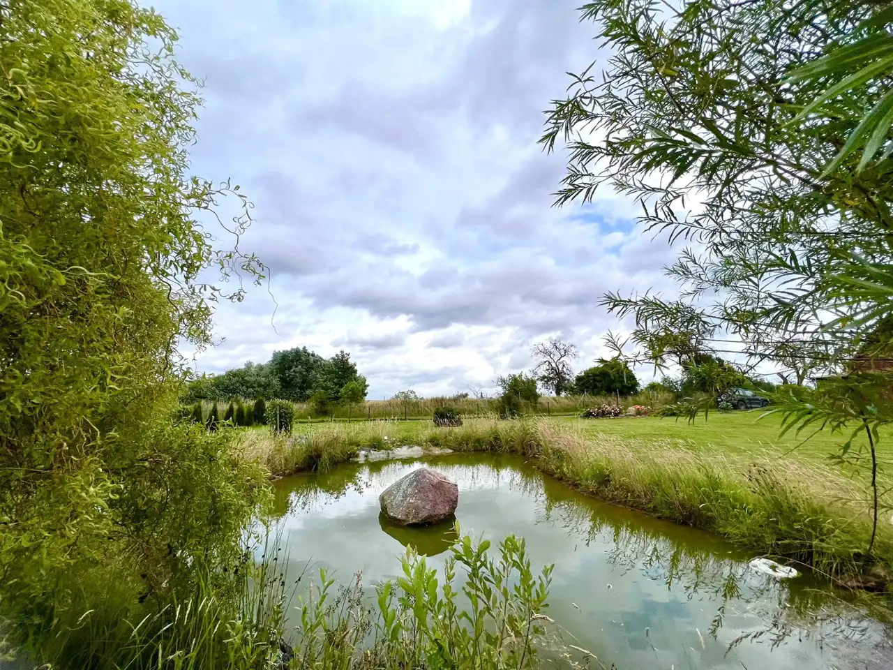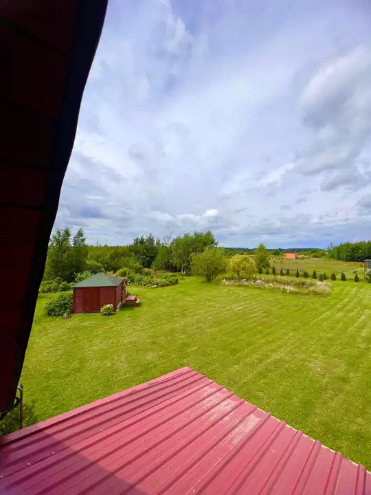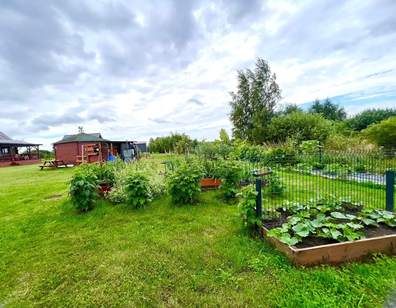Działka wynosi około 2040m2 (są to 2 działki z osobną KW). Na terenie działki znajduje się sauna infrared dla 4 osób. W szopie gospodarczej (9m2) znajduje się traktorek-kosiarka. W głąb działki widnieje palenisko wraz z rusztem. Na działce znajduje się sad, ogród warzywny oraz oczko wodne.