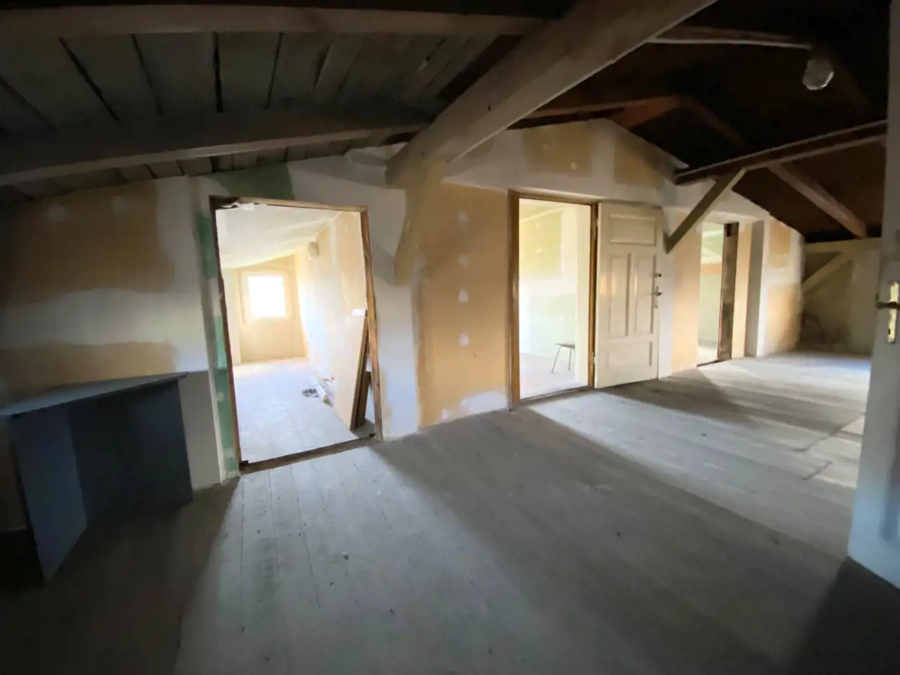 - duży strych, częściowo mieszkalny o powierzchni ponad 230m2 (wysokość od 1,75-2,4m)