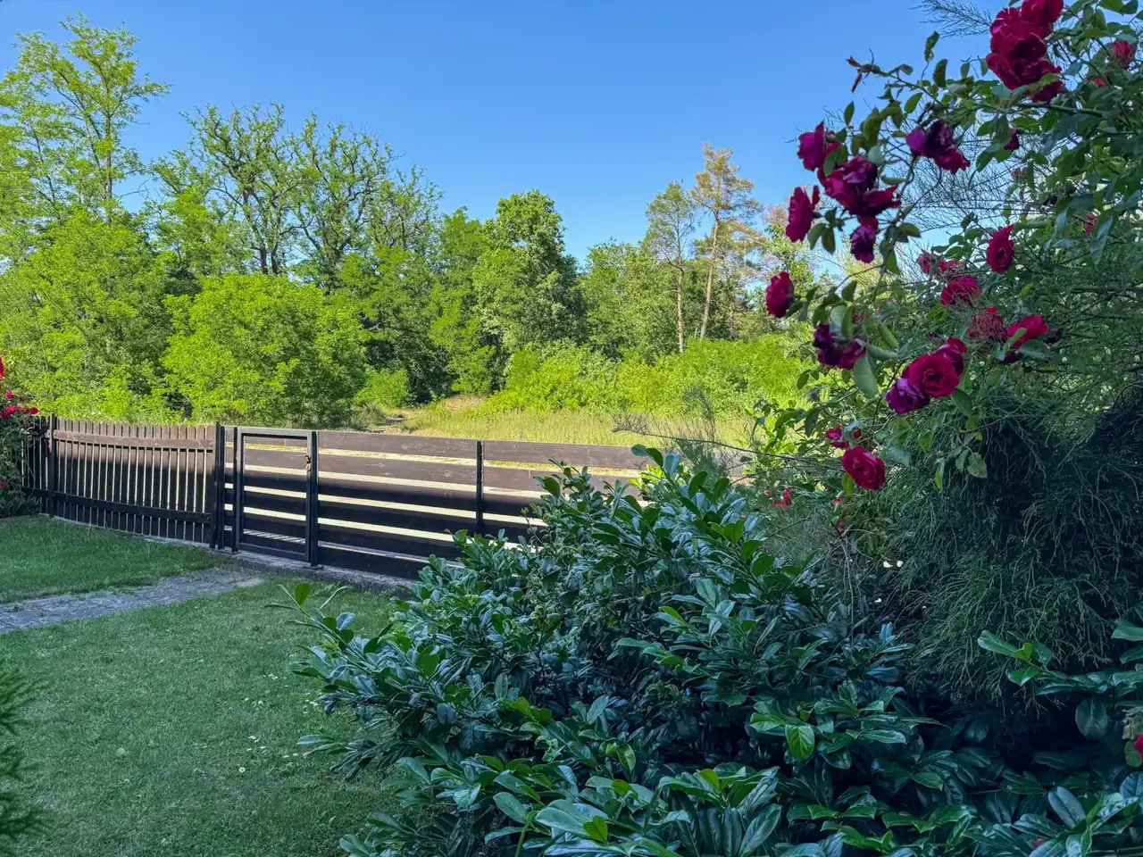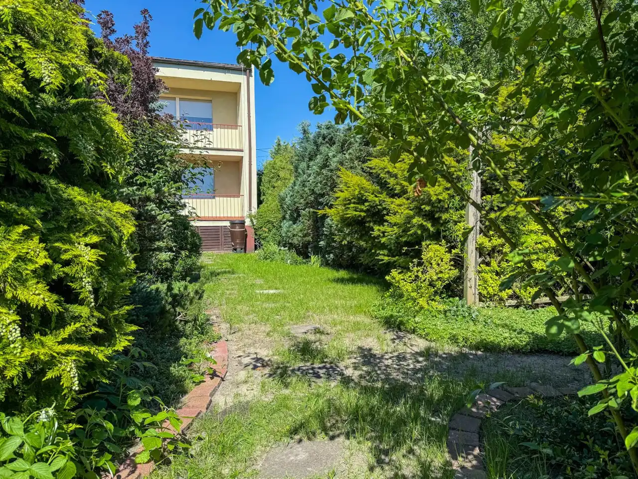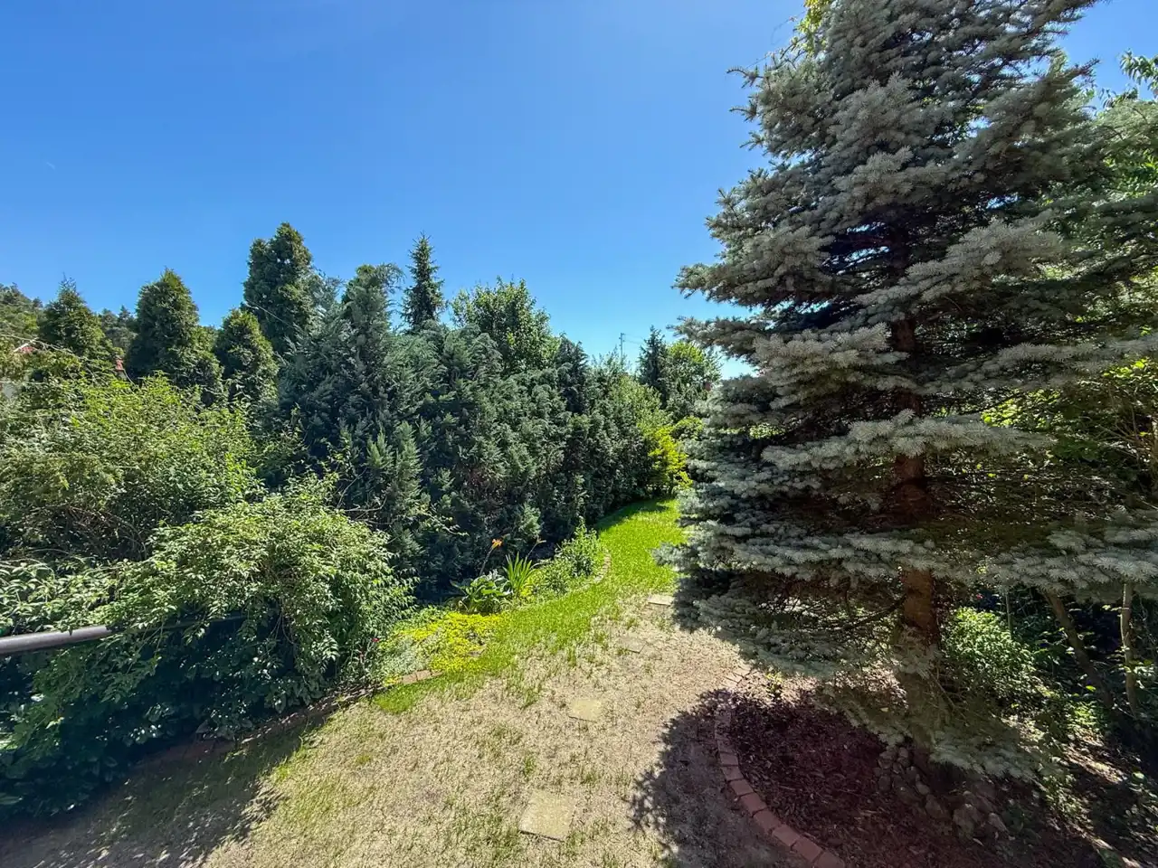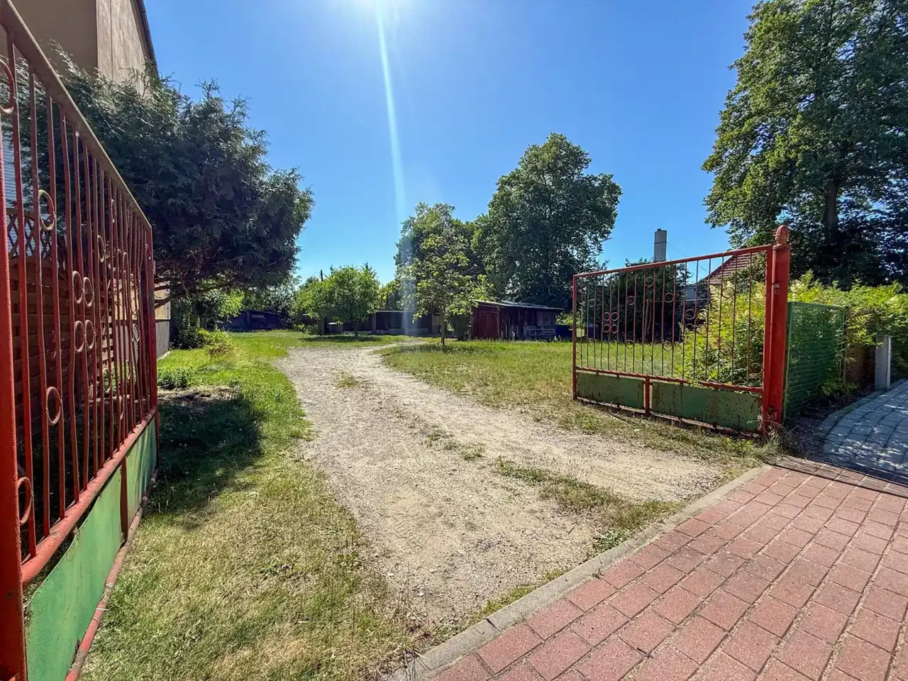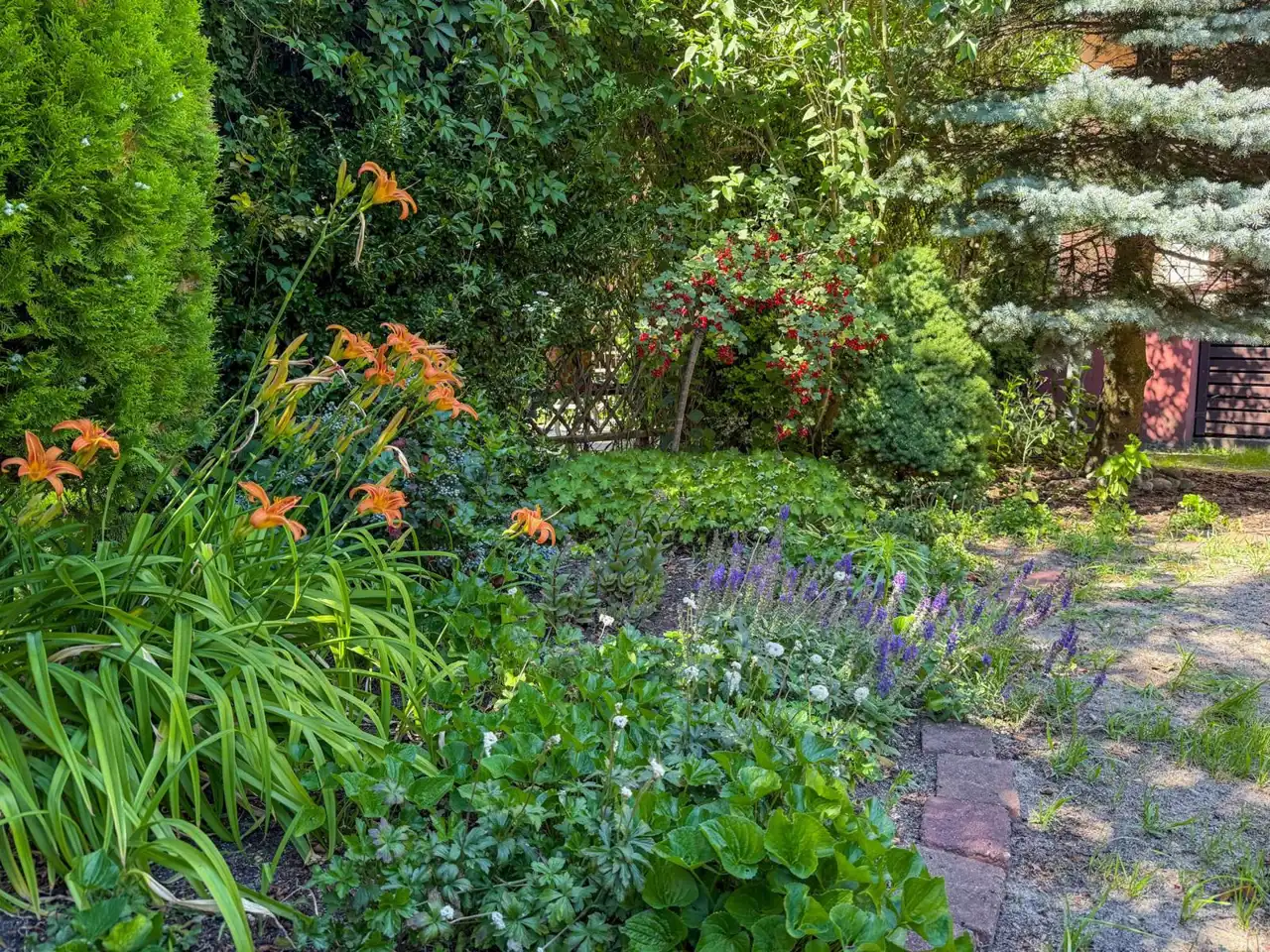 Zadbany ogród z nasadzeniami dającymi cień w upalne dni, świeżo wysiana trawa (maj 2025). Od frontu stylowe drewniane ogrodzenie. Dodatkowo – szopka o charakterze garażowym (posadzka betonowa, drewniane ściany) z 1995 roku, usytuowana na działce wspólnej (pełen udział w gruncie – 801 m²).