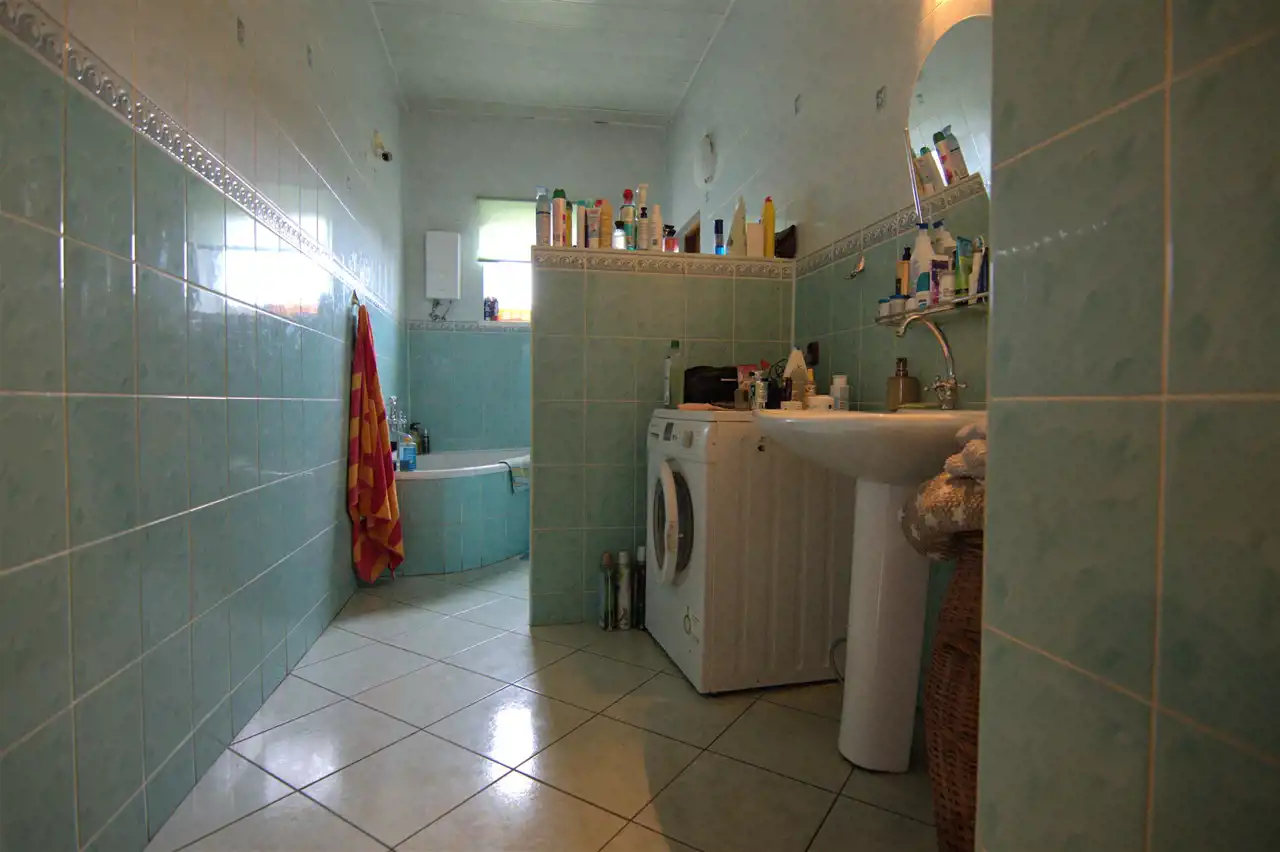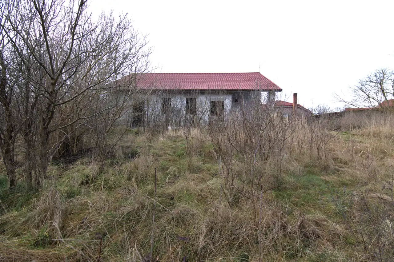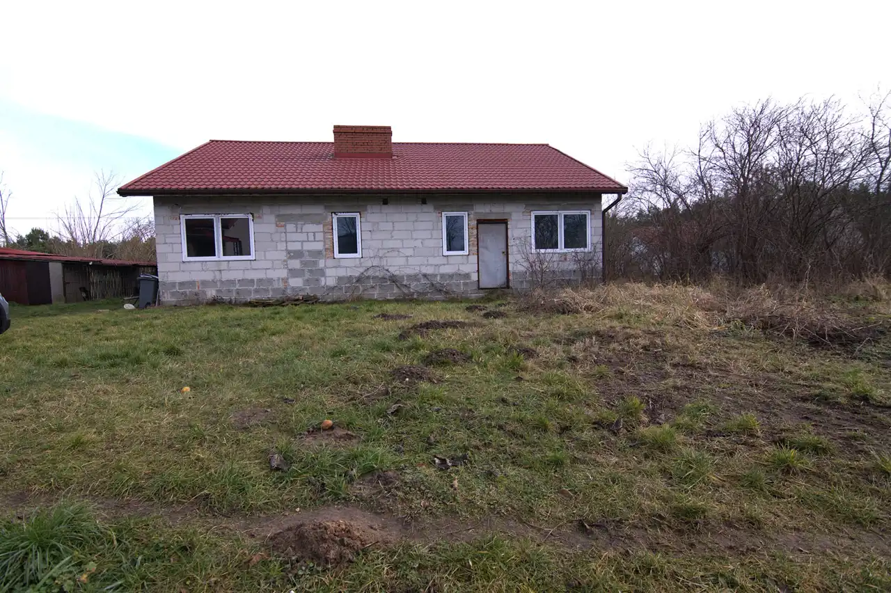 Drugi z domów zlokalizowany na przedmiotowej działce zaprojektowany jako nieruchomość mieszkalno - usługowa wybudowany do stanu surowego. Dach pokryty blachodachówką, wewnątrz - część ścianek działowych oraz część okien.