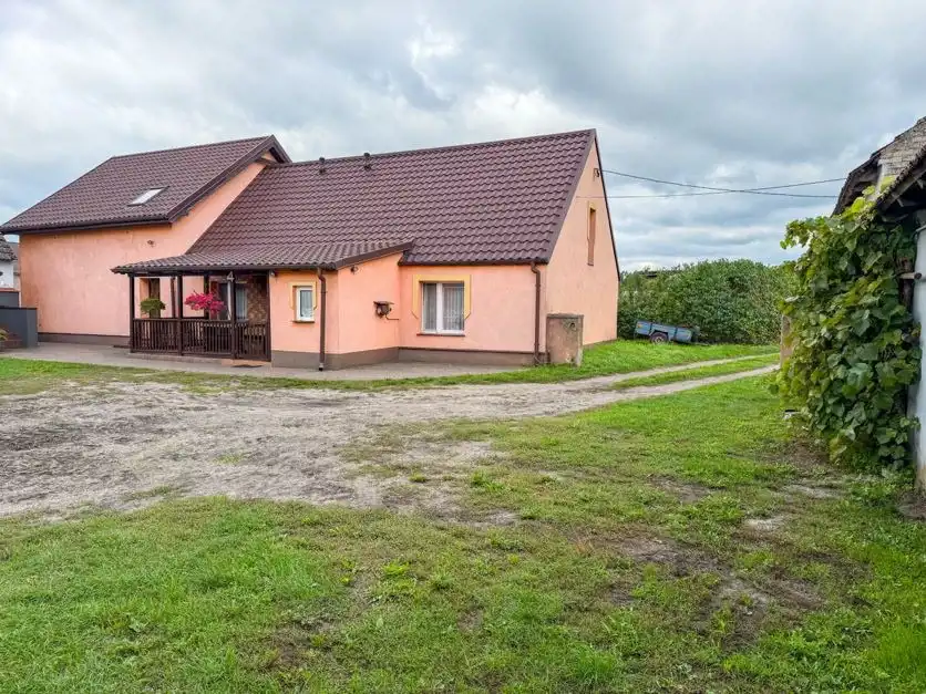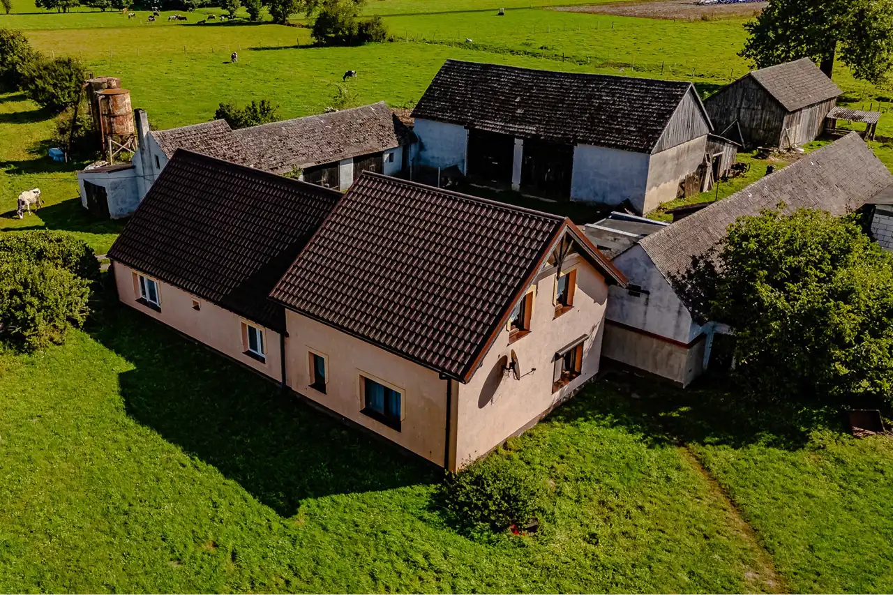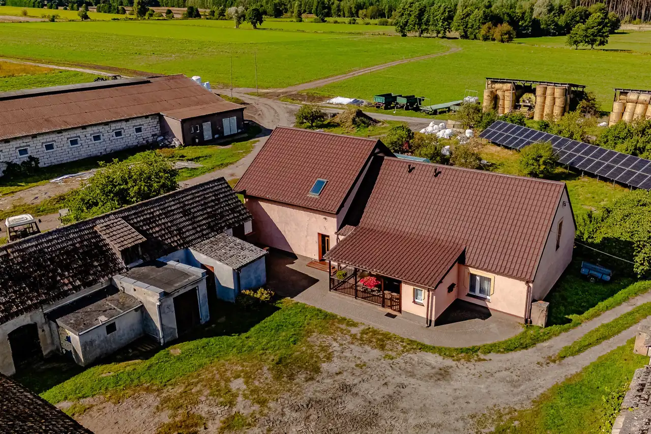 To kompletna nieruchomość – dom mieszkalny, nowa obora, magazyny, garaże, wiaty oraz baza paszowa.