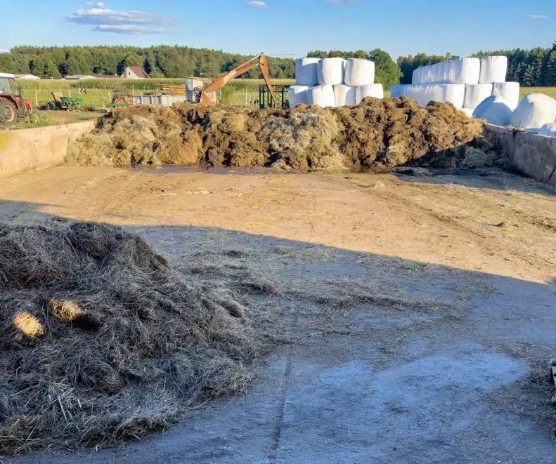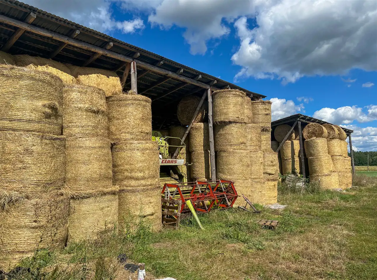 - 2 wiaty (po ok. 100 m²) – na kombajn i zapas balotów