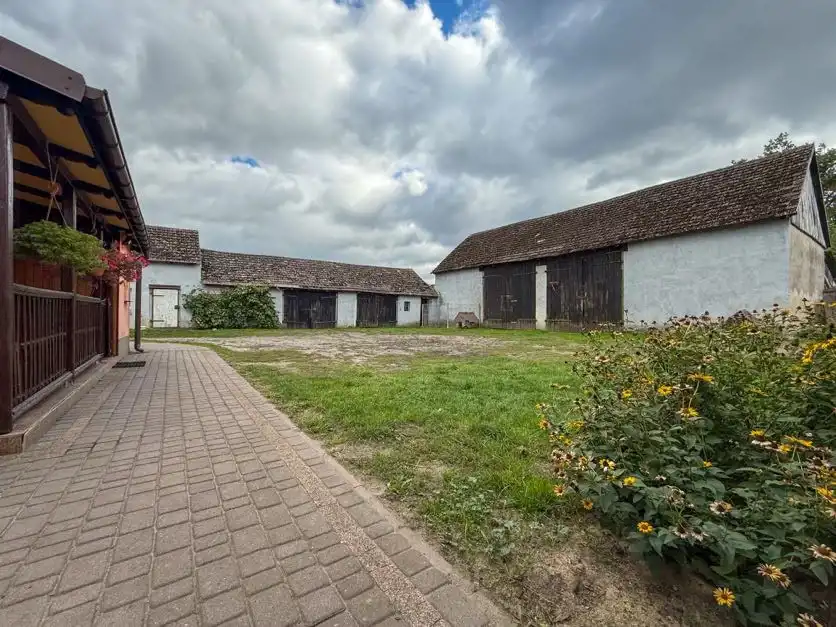 - Ciąg budynków gospodarczych (260 m²) – kotłownia, magazyn zboża, mieszalnia, śrutownik, garaż, kurnik, piwnica