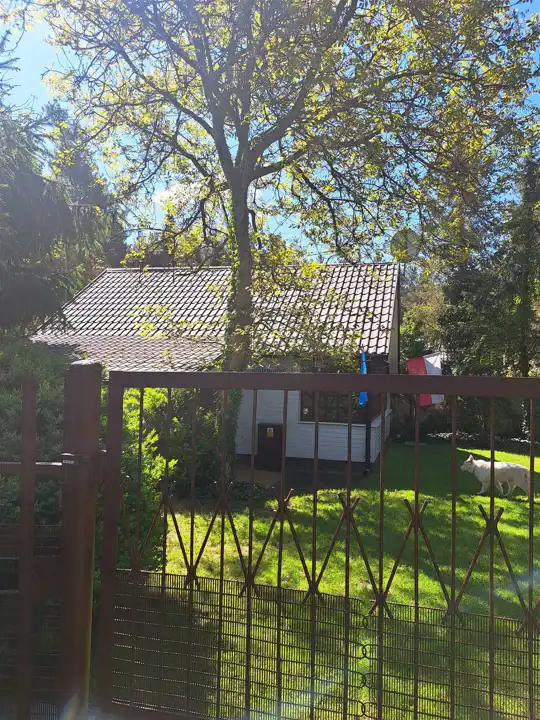 Cały teren jest ogrodzony, a działka zadbana, z licznymi nasadzeniami, co zapewnia prywatność i przytulny klimat.