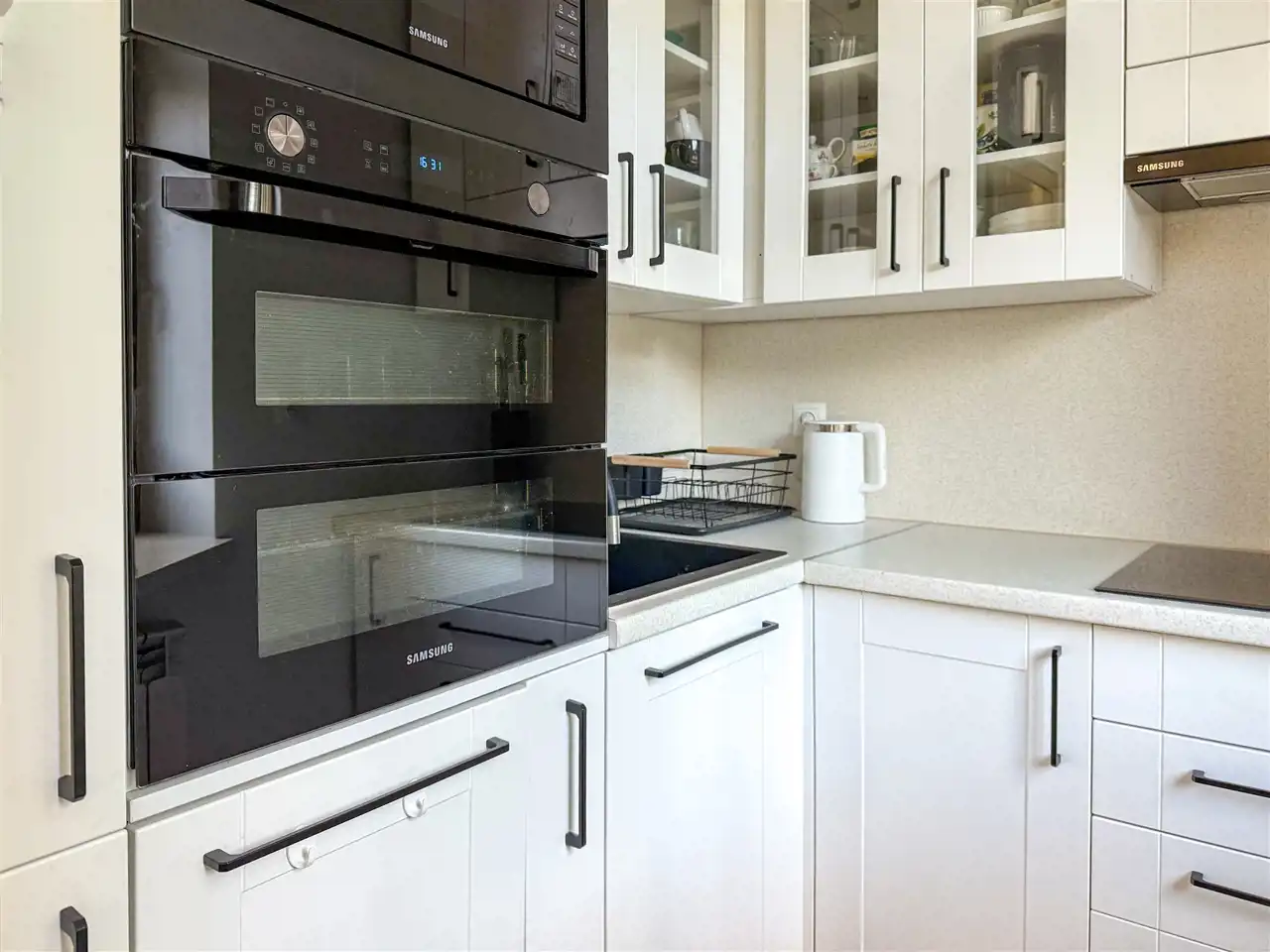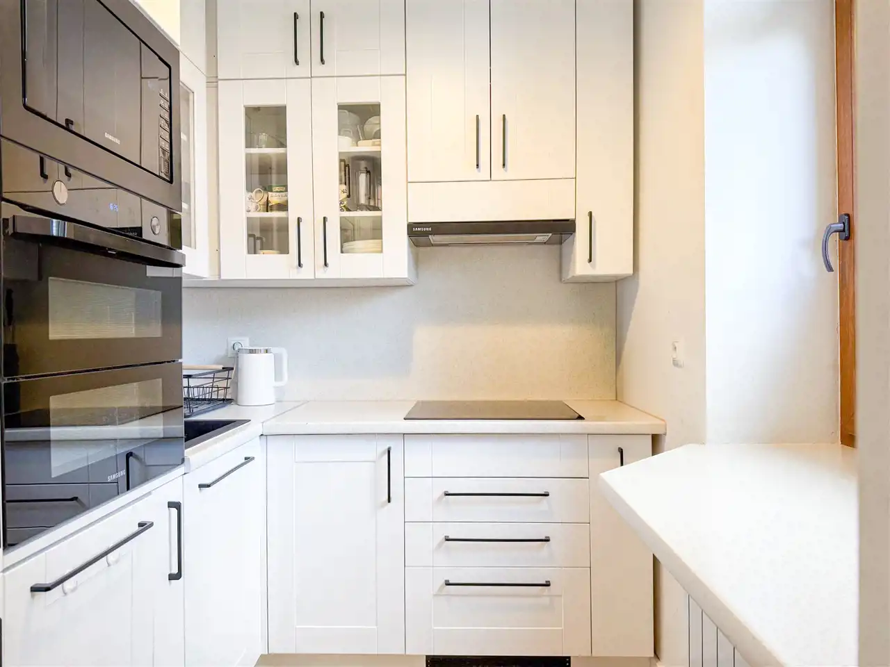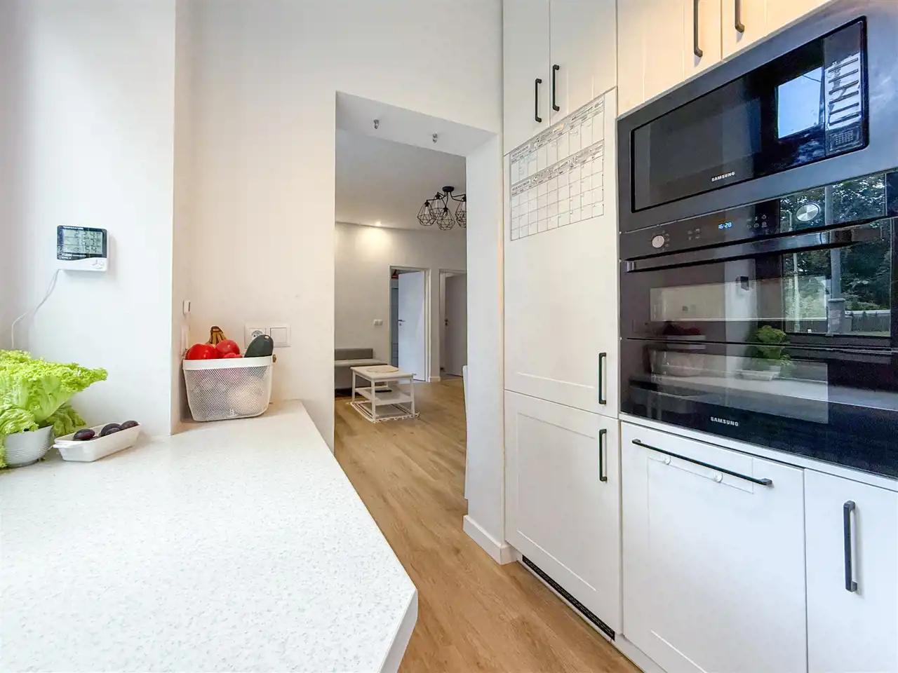 - Kuchnia (5 m²) – zabudowa na wymiar, AGD w komplecie: płyta indukcyjna, piekarnik, lodówka, mikrofalówka, zmywarka 40 cm – wszystko czeka