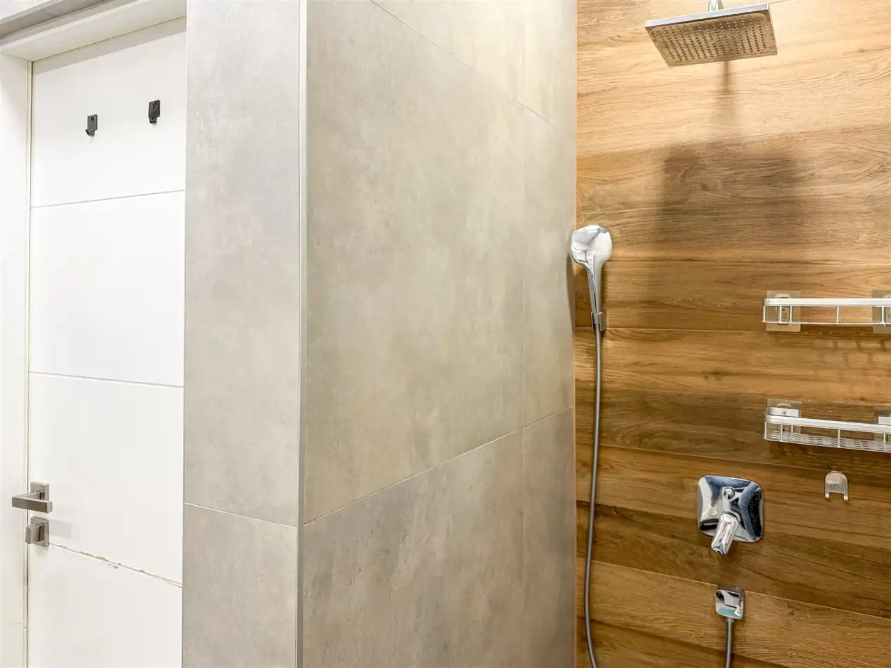 - Łazienka 3,80 m² – wnęka prysznicowa, nowoczesny posadzkowy brodzik, płytki, które nie boją się spojrzeń