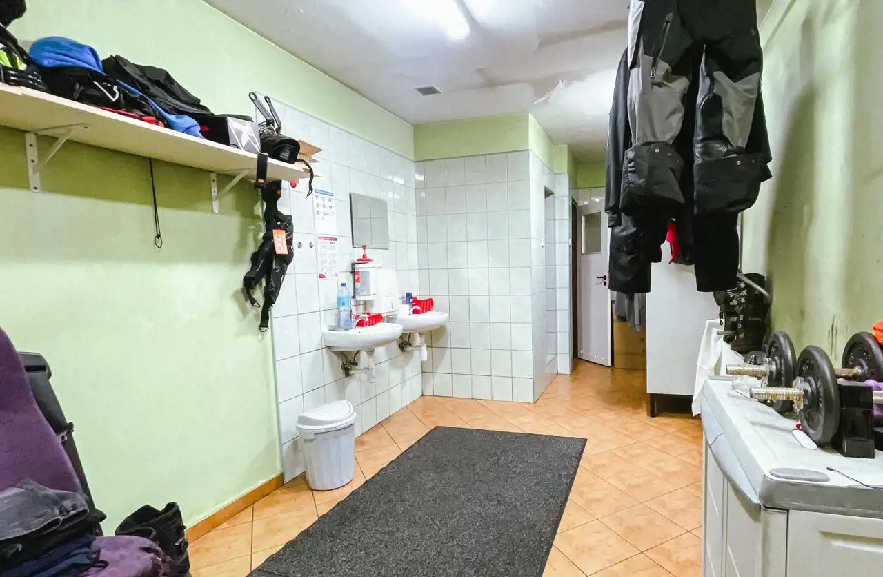 szatnia z umywalnią 15,01 m2, pomieszczenia sanitarne o łącznej powierzchni 4 m2 (w tym prysznic z bojlerem elektrycznym) oraz kotłownia 9,33 m2 (wymiana pieca na ekogroszek około 2 lata temu).