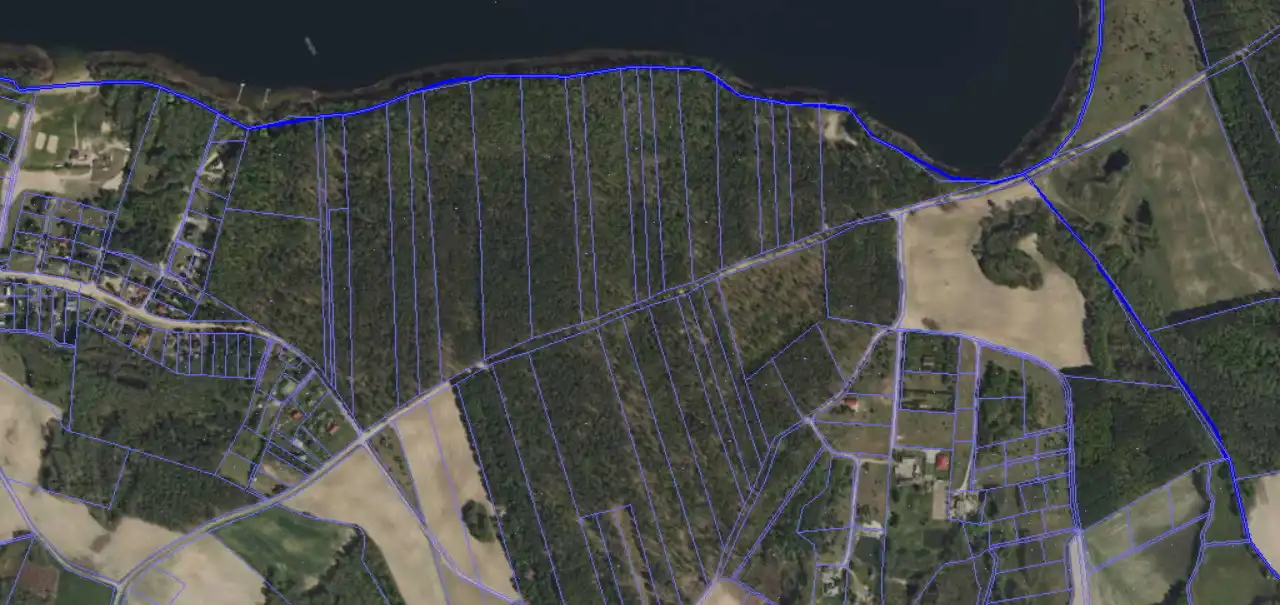 Działki płaskie, w kształcie prostokąta, porośnięte drzewami.