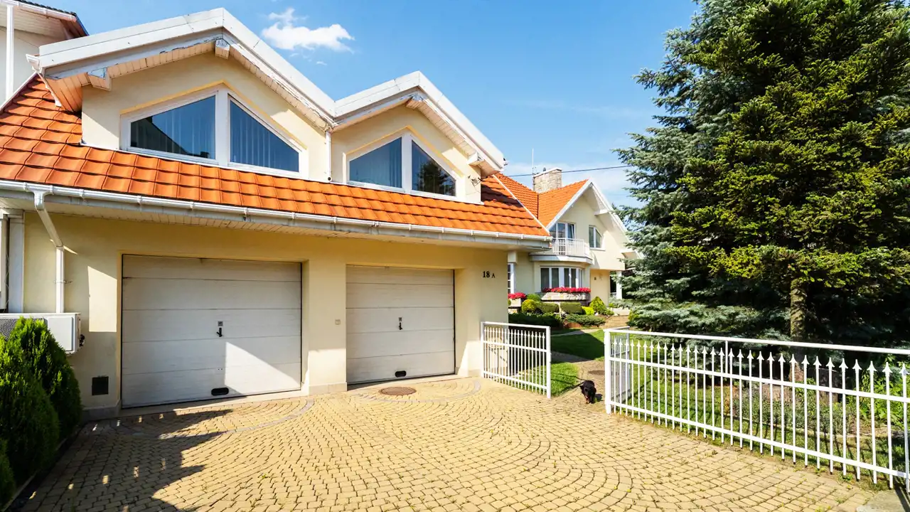 - An automatic sliding gate at the entrance to the two-car garage
