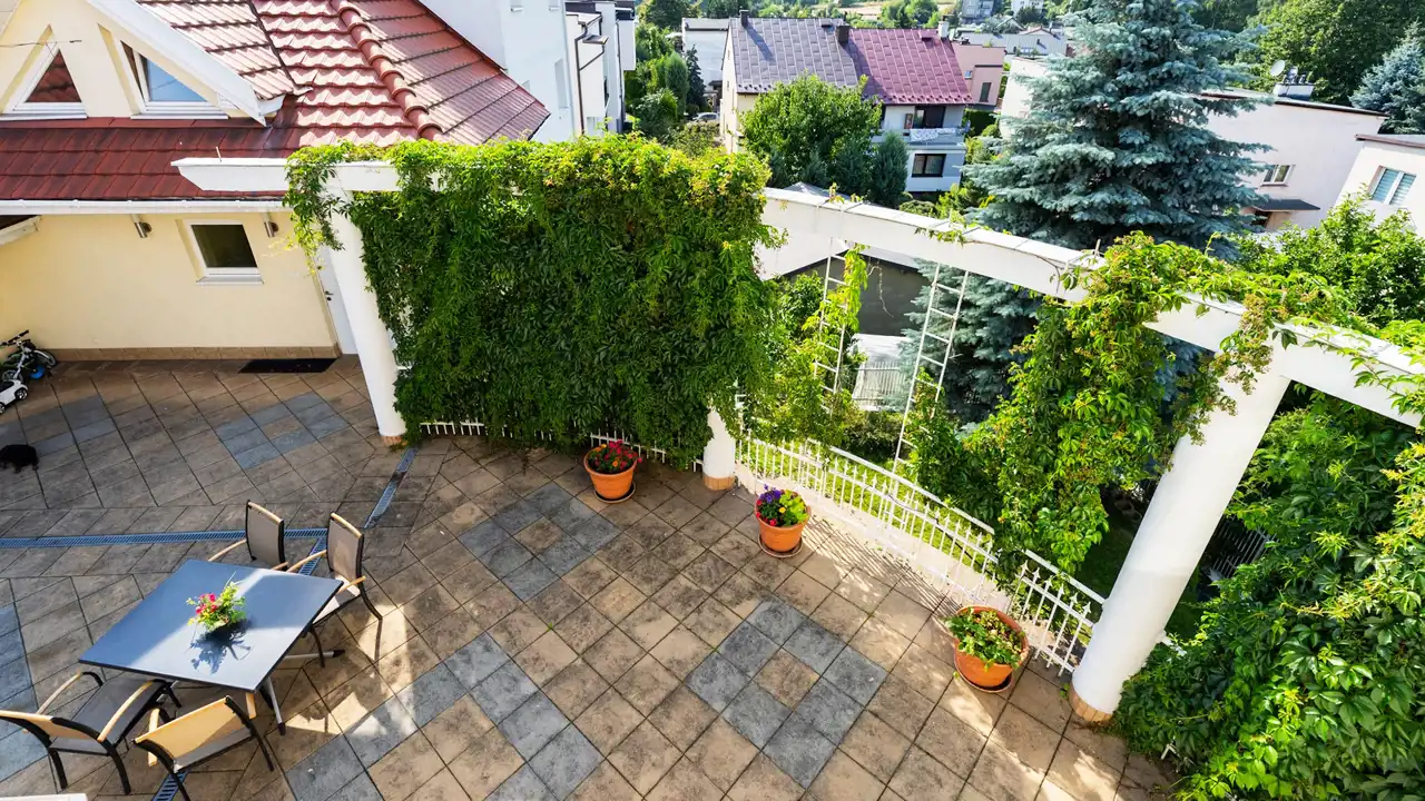 Budynki są ze sobą zintegrowane wspólnym ogrodem i tarasami a całość dopełnia majestatyczna pergola tworząca klimat w stylu włoskiej willi.