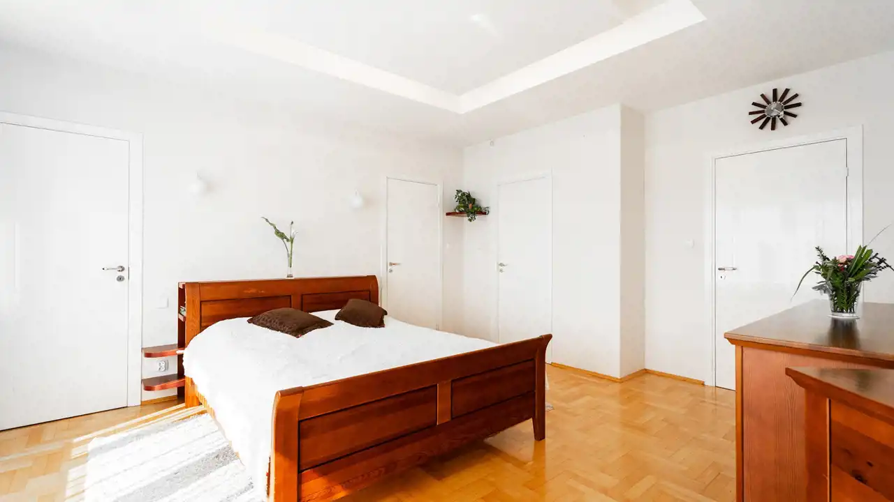 - Room 4 (master bedroom) 19.3 m² with two side wardrobes and a master wardrobe (planned to be a private bathroom - there are connections and drains)