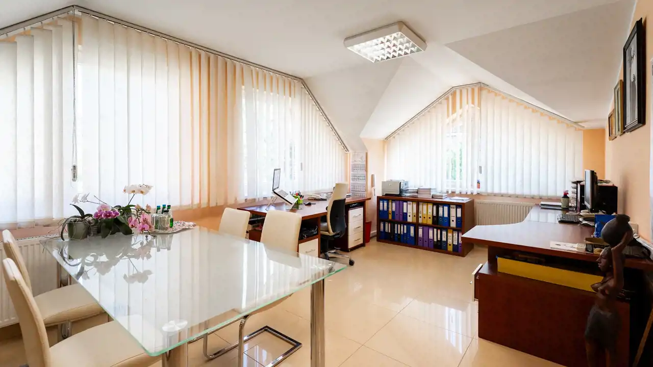 This is no ordinary property, as it is divided into a large, comfortable three-story house and a second building serving as technical and office space.