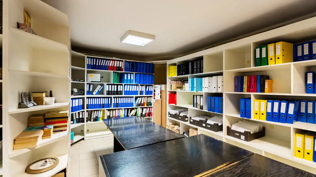 It serves as an office and storage space and has a separate central heating system and a plumbing unit.
