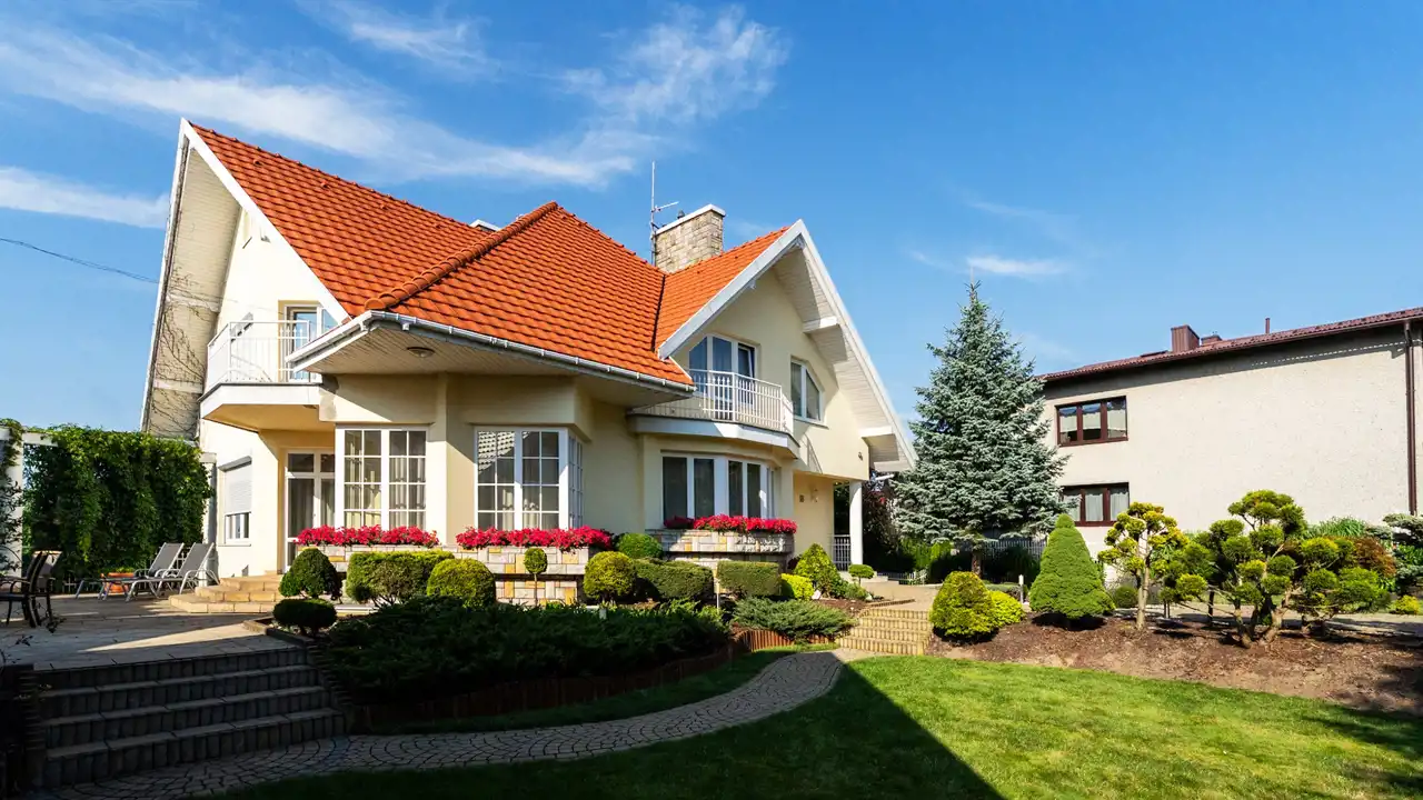 The well-maintained garden draws attention, emphasizing the residential character of the property.