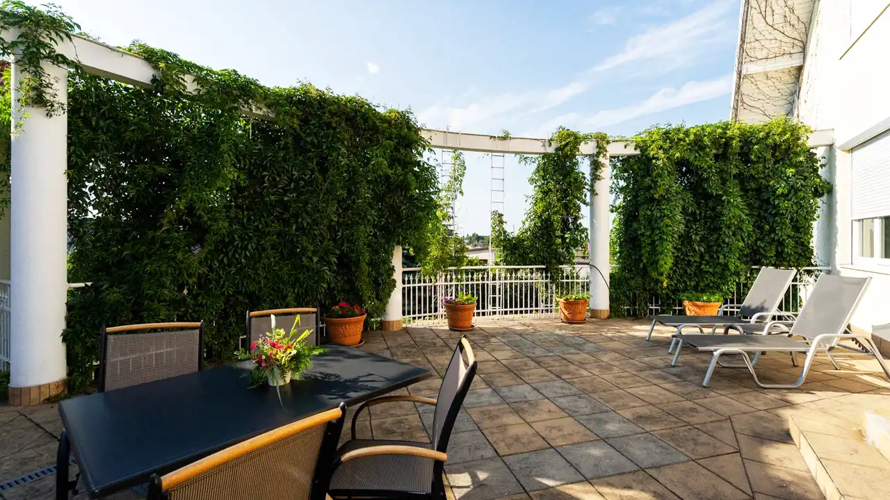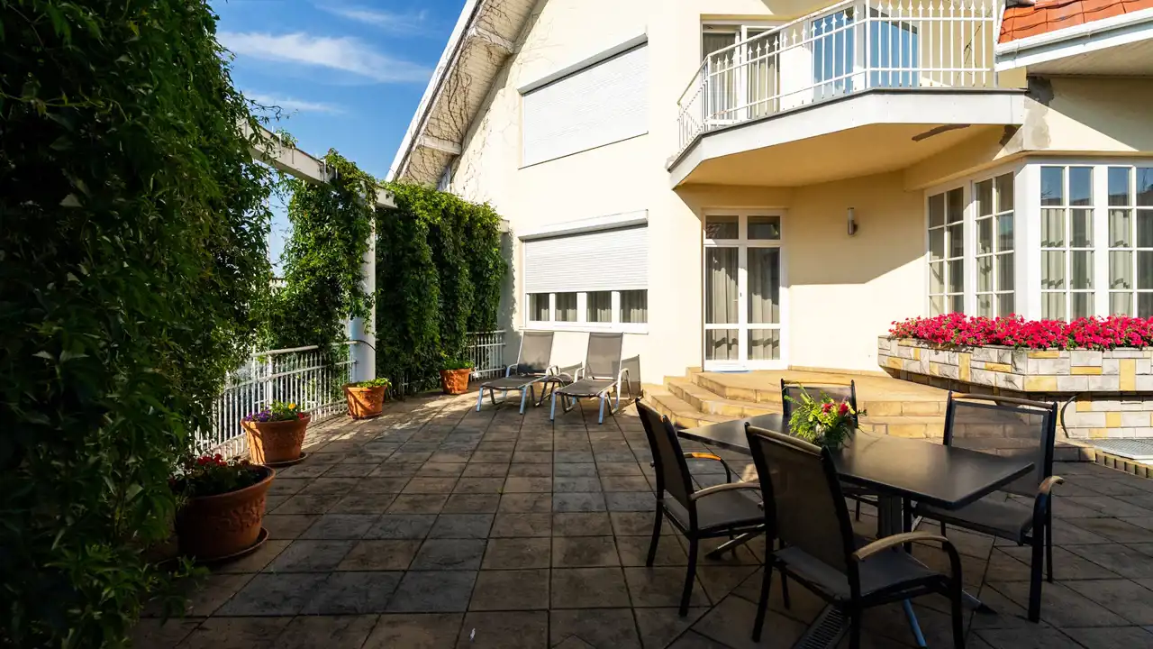 - two large connecting rooms (18 and 29.7 m²) with access to the north-facing terrace with an arcade