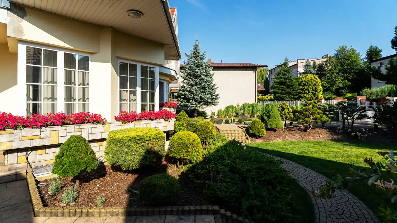 Zadbany, reprezentacyjny z licznymi gatunkami iglaków ręcznie formowanych, traw ozdobnych, trawnika z systemem nawadniania oraz podjazdem i alejkami z kostki brukowej.