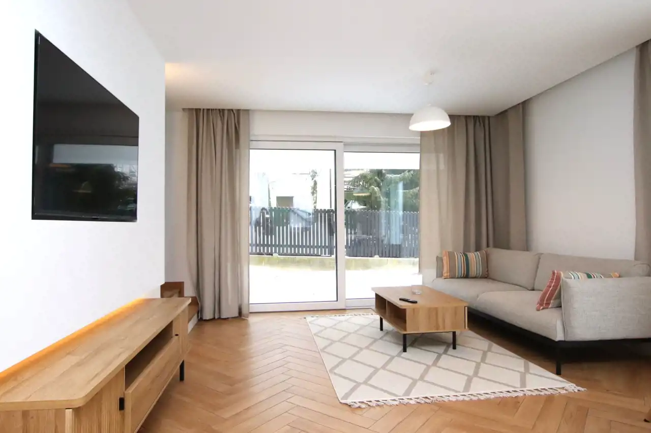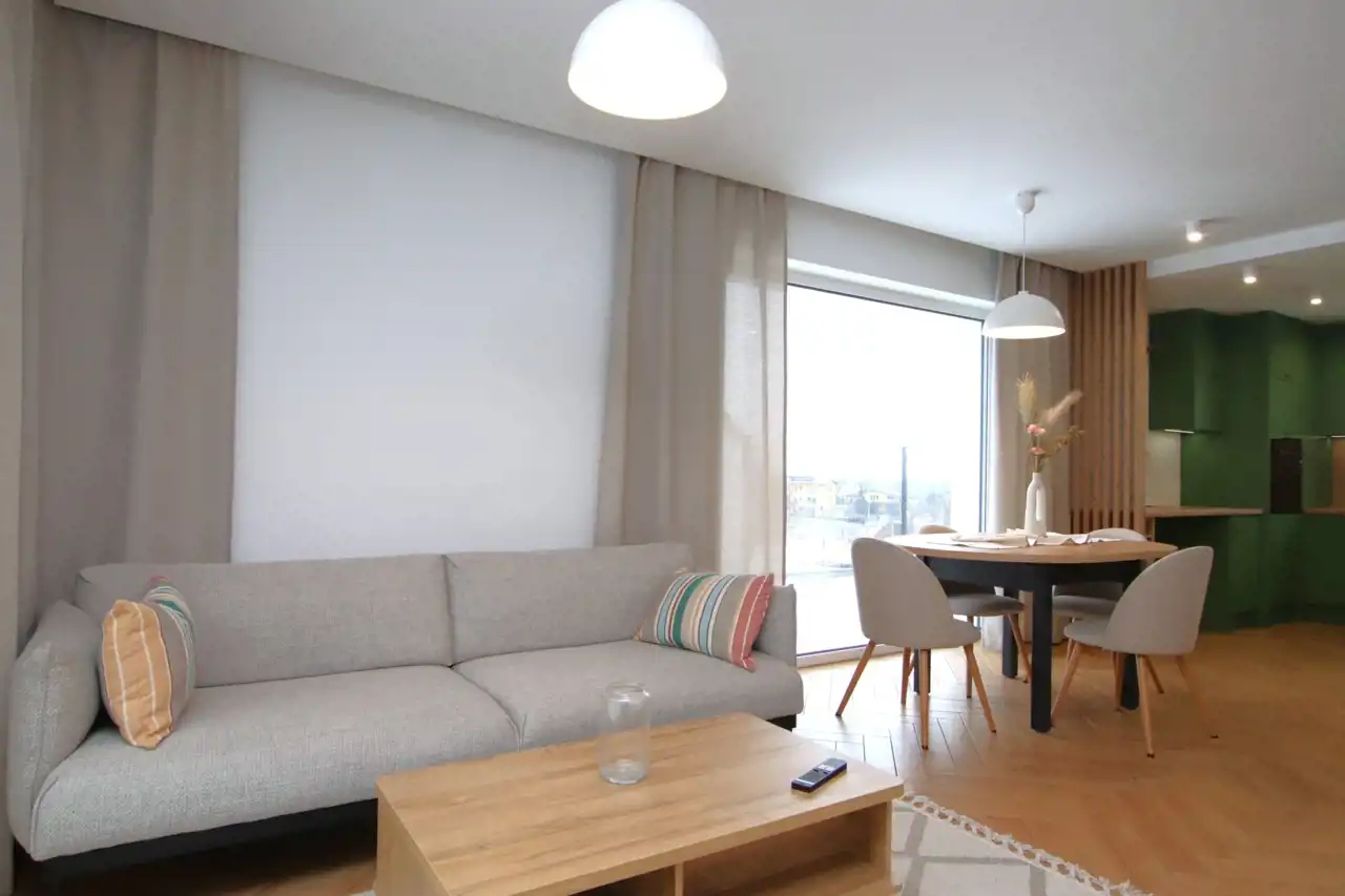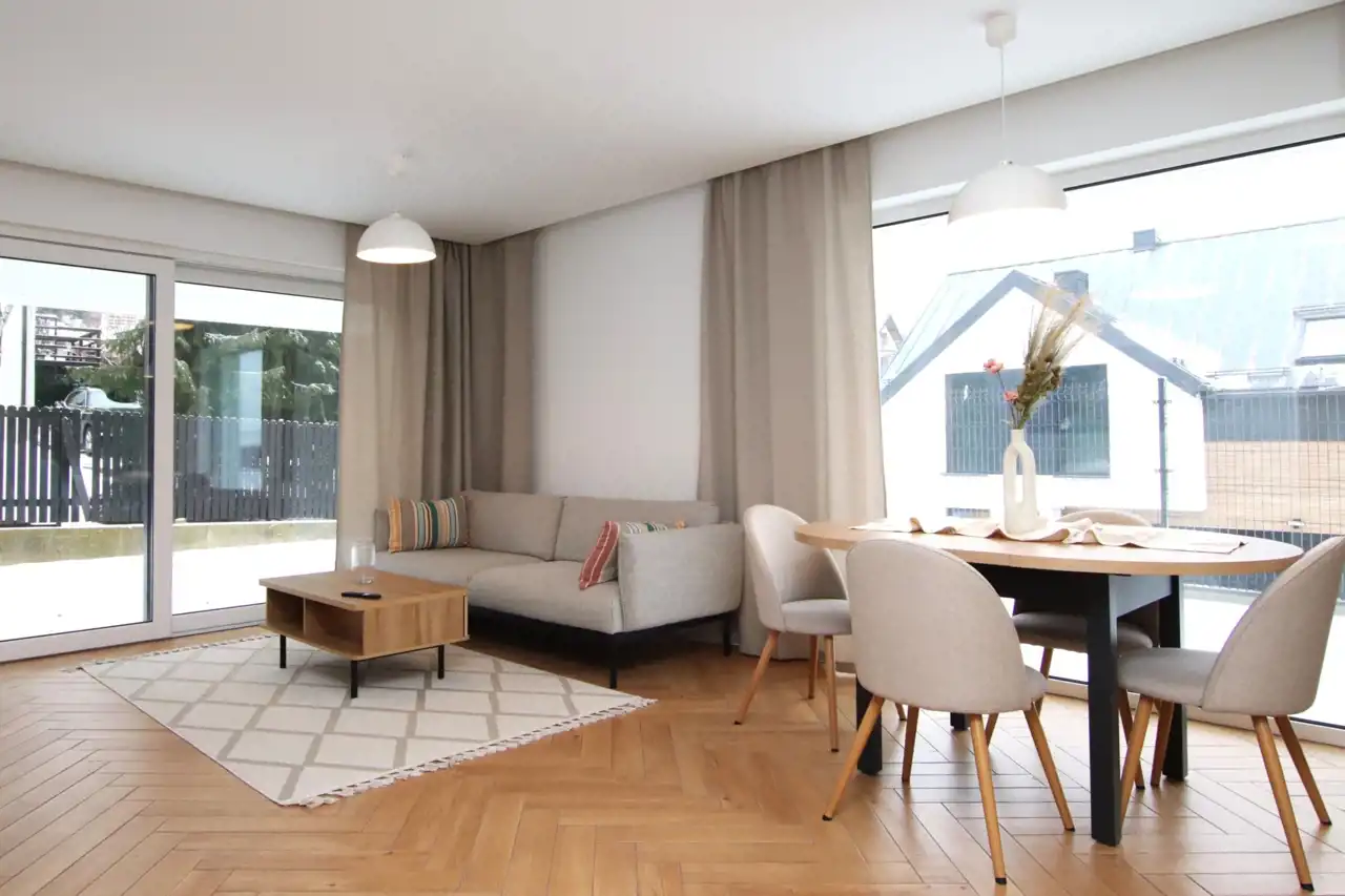 - elegancki salon połączony z jadalnią i aneksem kuchennym oraz wyjściem na taras,