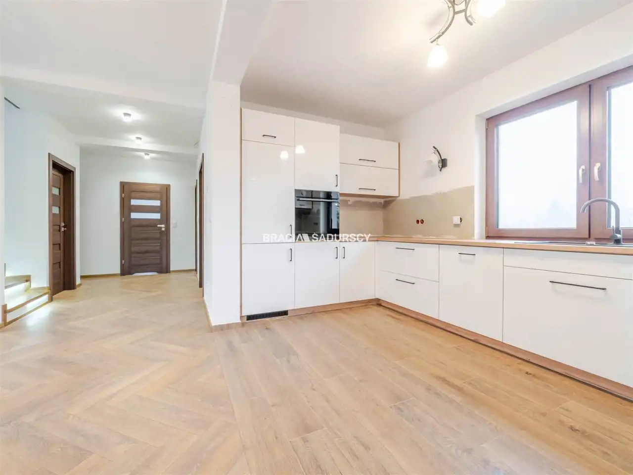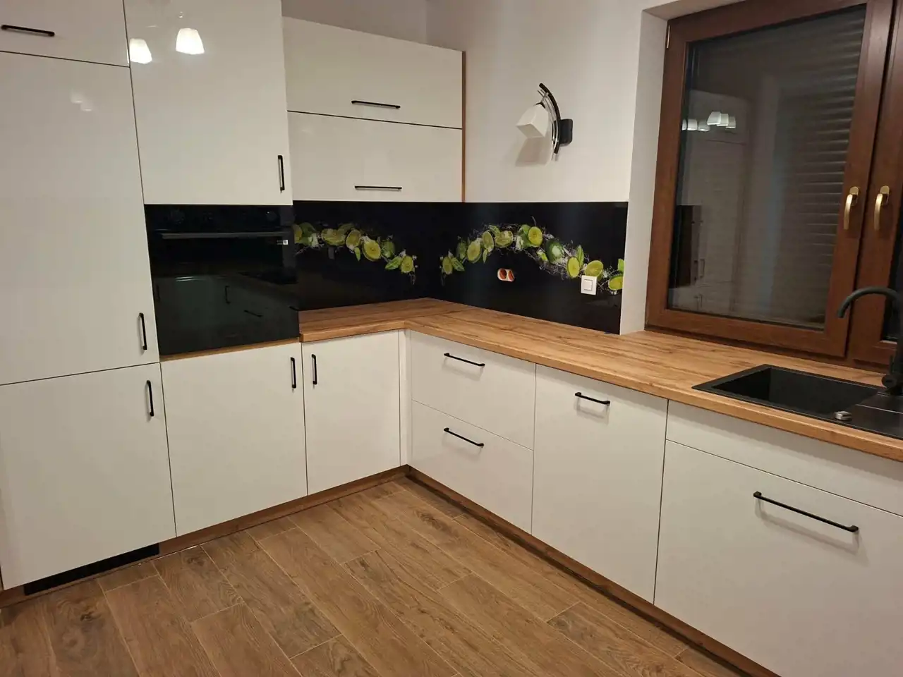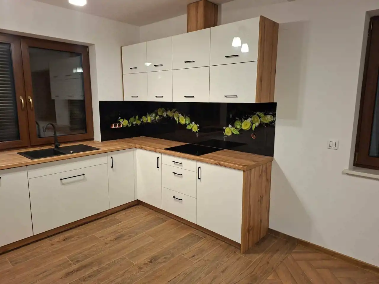 Dom oferuje 6 przestronnych pokoi, w tym elegancki salon z aneksem kuchennym. Kuchnia została wyposażona w meble wykonane na zamówienie oraz sprzęt AGD w zabudowie, co zapewnia wysoką estetykę, ergonomię i komfort codziennego użytkowania.