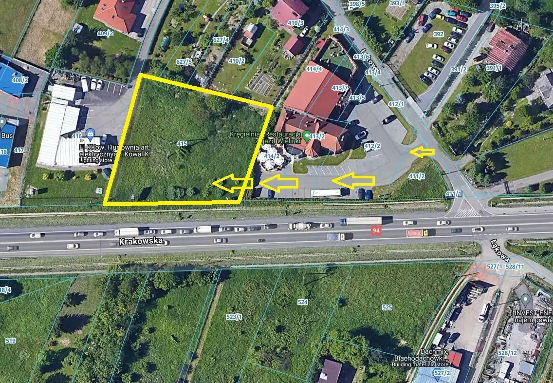 Front działki znajduje się bezpośrednio przy drodze wojewódzkiej – jednym z głównych szlaków komunikacyjnych w rejonie Wieliczki.