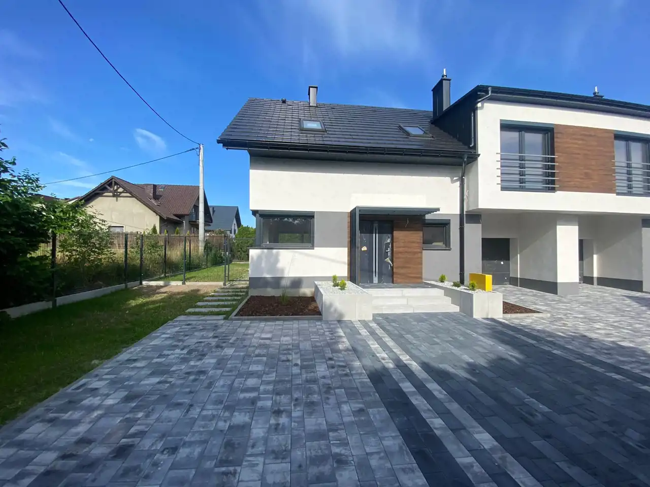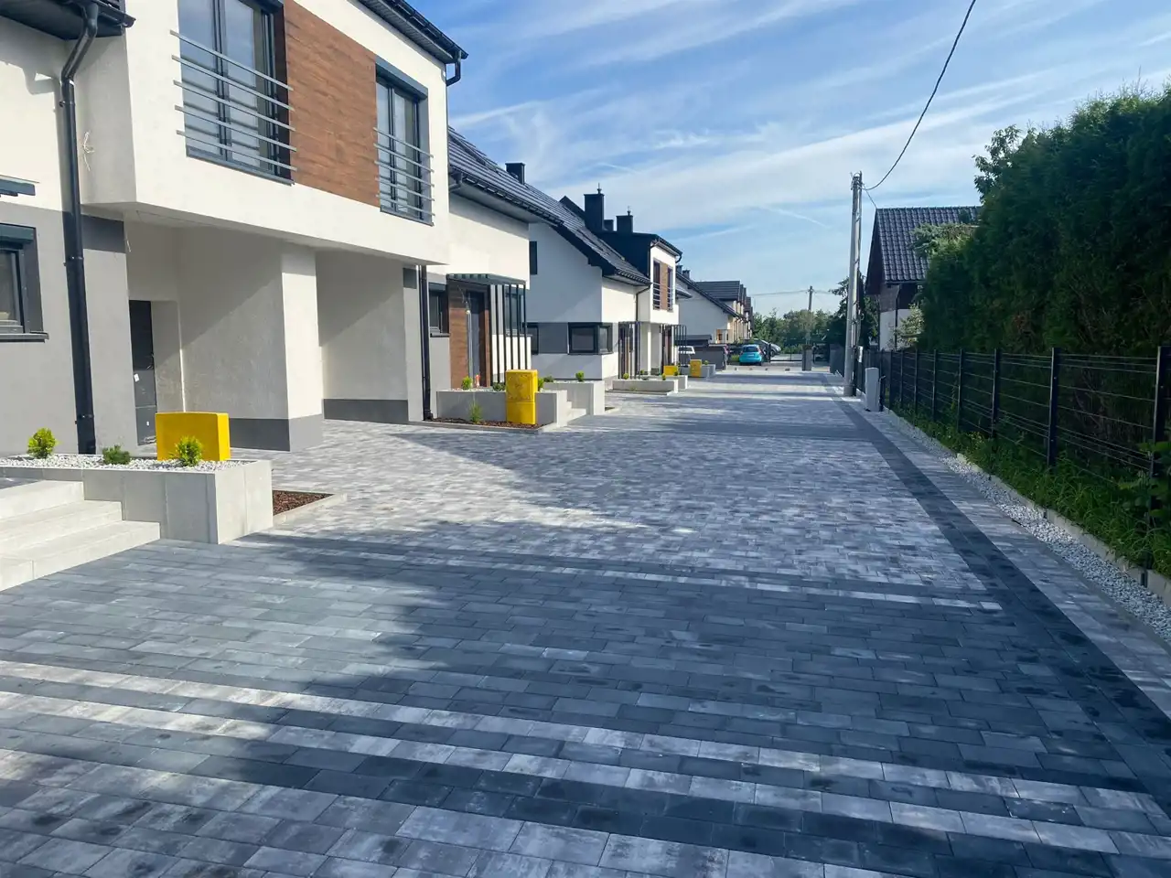 Prywatna droga o szerokości 7 metrów wykonana jest z kostki brukowej, gwarantuje wygodę i swobodę w poruszaniu się oraz parkowaniu.