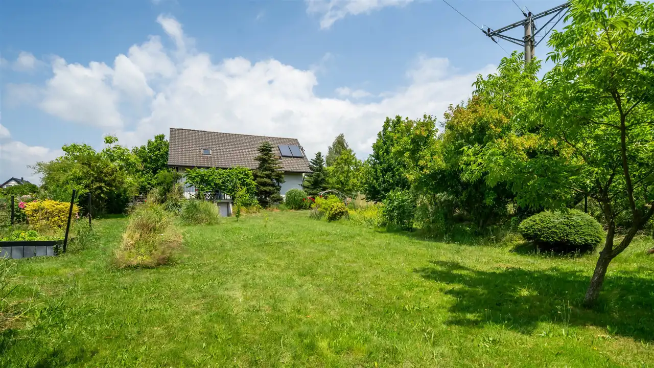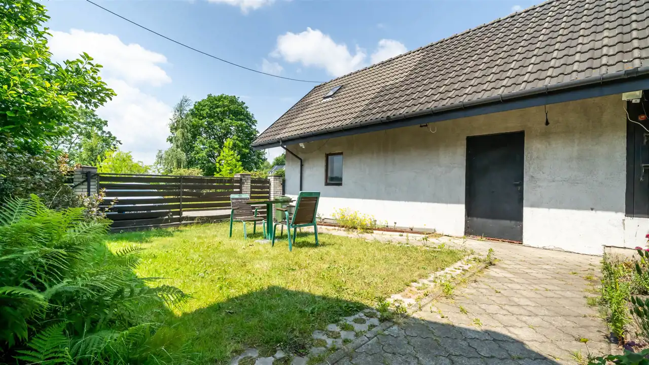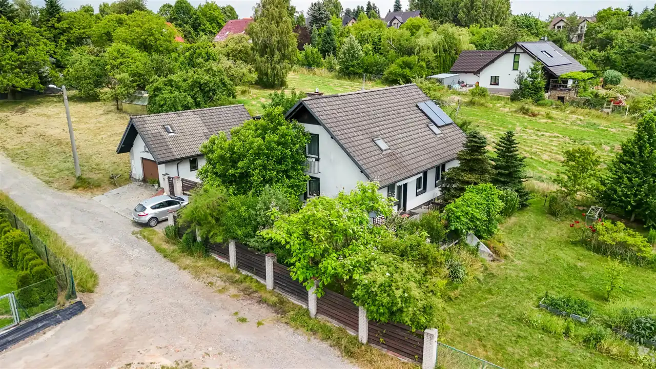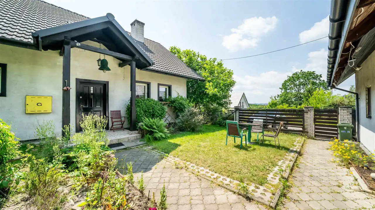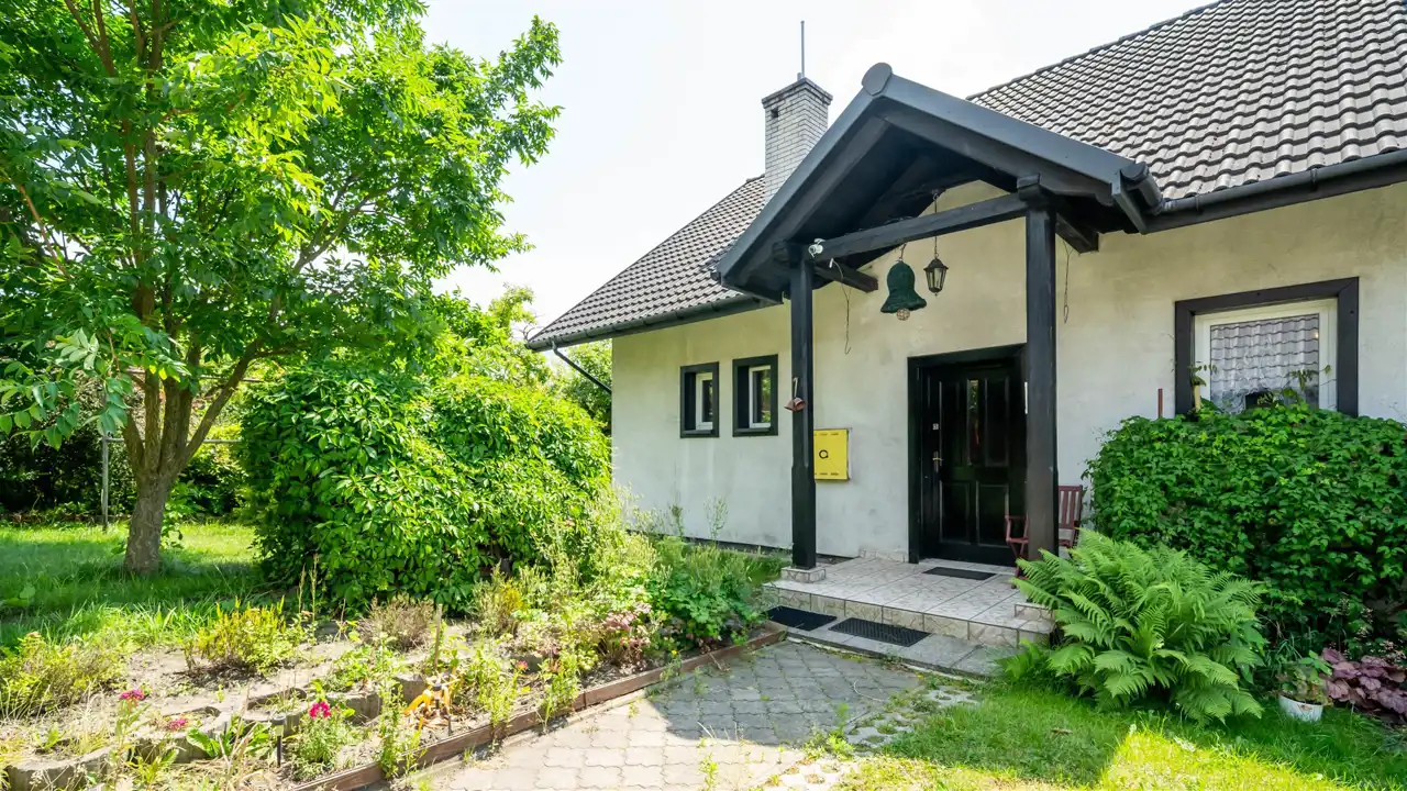 Na pięknie zagospodarowanej 17-arowej działce znajduje się wolnostojący, rodzinny dom z 2000 roku o powierzchni 144 m², który zachwyca już od pierwszego kroku. Otoczony zielenią, kwiatami, drzewami i zarybionym stawem – ten ogród wygląda jak z ilustracji w książce dla dzieci. Regularnym gościem w stawie jest zaprzyjaźniony żółw, który stał się nieformalnym mieszkańcem posesji.