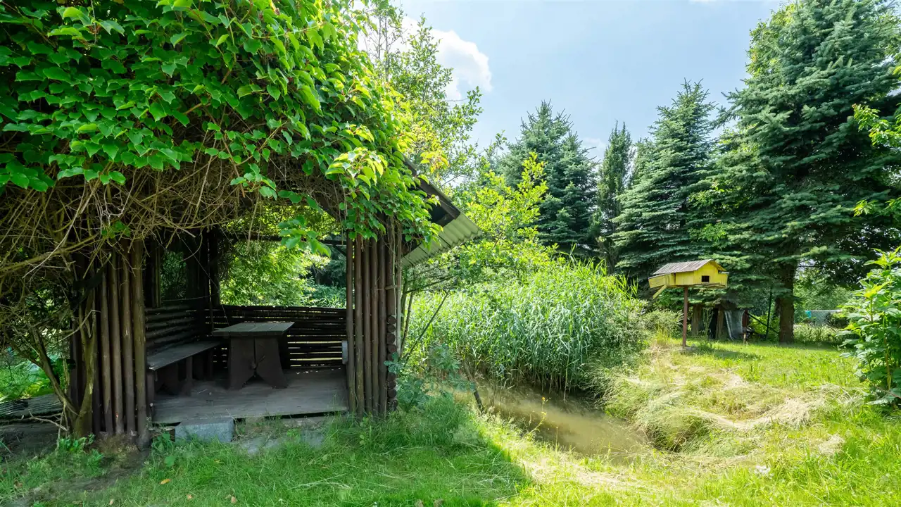 17 arów zieleni – starannie zagospodarowany ogród z miejscami do wypoczynku, cienia i relaksu.